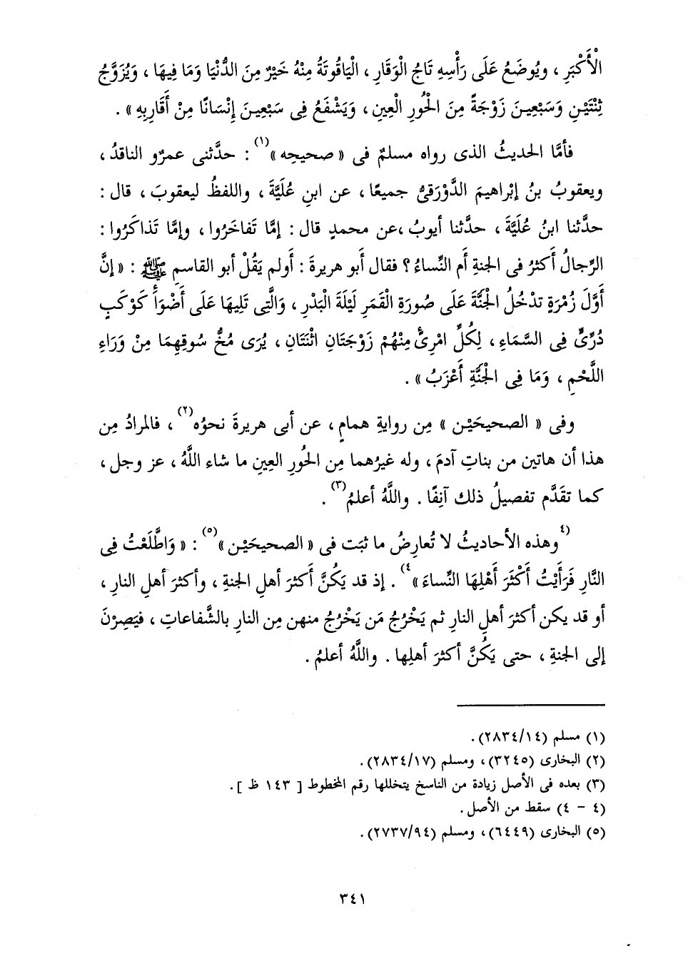 فَأَمَّا الْحَدِيثُ الَّذِي رَوَاهُ مُسْلِمٌ فِي " صَحِيحِهِ ": حَدَّثَنِي عَمْرٌو النَّاقِدُ، وَيَعْقُوبُ بْنُ إِبْرَاهِيمَ الدَّوْرَقِيُّ جَمِيعًا، عَنِ ابْنِ عُلَيَّةَ، وَاللَّفْظُ لِيَعْقُوبَ، قَالَ: حَدَّثَنَا ابْنُ عُلَيَّةَ، حَدَّثَنَا أَيُّوبُ، عَنْ مُحَمَّدٍ قَالَ: «إِمَّا تَفَاخَرُوا، وَإِمَّا تَذَاكَرُوا: الرِّجَالُ أَكْثَرُ فِي الْجَنَّةِ أَمِ النِّسَاءُ؟ فَقَالَ أَبُو هُرَيْرَةَ: أَوَلَمْ يَقُلْ أَبُو الْقَاسِمِ صَلَّى اللَّهُ عَلَيْهِ وَسَلَّمَ: إِنَّ أَوَّلَ زُمْرَةٍ تَدْخُلُ الْجَنَّةَ عَلَى صُورَةِ الْقَمَرِ لَيْلَةَ الْبَدْرِ، وَالَّتِي تَلِيهَا عَلَى أَضْوَأِ كَوْكَبٍ دُرِّيٍّ فِي السَّمَاءِ، لِكُلِّ امْرِئٍ مِنْهُمْ زَوْجَتَانِ اثْنَتَانِ، يُرَى مُخُّ سُوقِهِمَا مِنْ وَرَاءِ اللَّحْمِ، وَمَا فِي الْجَنَّةِ أَعْزَبُ» ".
