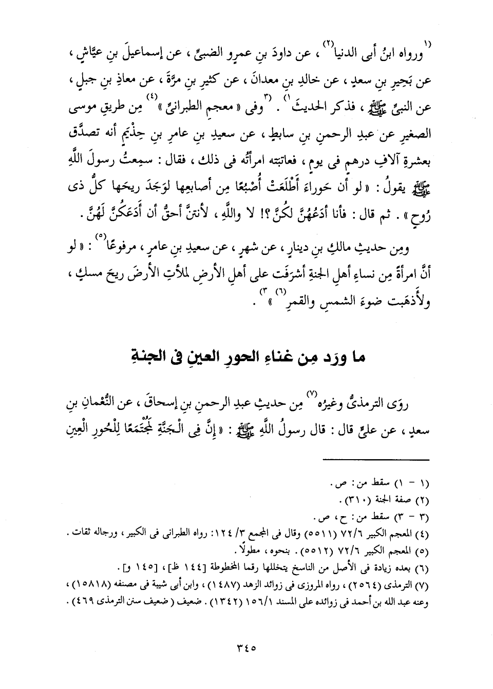 وَرَوَاهُ ابْنُ أَبِي الدُّنْيَا، عَنْ دَاوُدَ بْنِ عَمْرٍو الضَّبِّيِّ، عَنْ إِسْمَاعِيلَ بْنِ عَيَّاشٍ، عَنْ بَحِيرِ بْنِ سَعْدٍ، عَنْ خَالِدِ بْنِ مَعْدَانَ، عَنْ كَثِيرِ بْنِ مُرَّةَ، عَنْ مُعَاذِ بْنِ جَبَلٍ، عَنِ النَّبِيِّ صَلَّى اللَّهُ عَلَيْهِ وَسَلَّمَ، فَذَكَرَ الْحَدِيثَ. وَفِي " مُعْجَمِ الطَّبَرَانِيِّ " مِنْ طَرِيقِ مُوسَى الصَّغِيرِ عَنْ عَبْدِ الرَّحْمَنِ بْنِ سَابِطٍ، عَنْ سَعِيدِ بْنِ عَامِرِ بْنِ حِذْيَمٍ أَنَّهُ تَصَدَّقَ بِعَشَرَةِ آلَافِ دِرْهَمٍ فِي يَوْمٍ، فَعَاتَبَتْهُ امْرَأَتُهُ فِي ذَلِكَ، فَقَالَ: سَمِعْتُ رَسُولَ اللَّهِ صَلَّى اللَّهُ عَلَيْهِ وَسَلَّمَ يَقُولُ: «لَوْ أَنَّ حَوْرَاءَ أَطْلَعَتْ أُصْبُعًا مِنْ أَصَابِعِهَا لَوَجَدَ رِيحَهَا كُلُّ ذِي رِيحٍ ". ثُمَّ قَالَ: فَأَنَا أَدَعُهُنَّ لَكُنَّ؟ ! لَا وَاللَّهِ، لَأَنْتُنَّ أَحَقُّ أَنْ أَدَعَكُنَّ لَهُنُّ» .