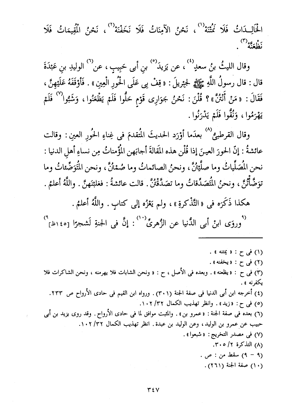 وَقَالَ الْقُرْطُبِيُّ بَعْدَمَا أَوْرَدَ الْحَدِيثَ الْمُتَقَدِّمَ فِي غِنَاءِ الْحُورِ الْعِينِ: وَقَالَتْ عَائِشَةُ: إِنَّ الْحُورَ الْعِينَ إِذَا قُلْنَ هَذِهِ الْمَقَالَةَ أَجَابَهُنَّ الْمُؤْمِنَاتُ مِنْ نِسَاءِ أَهْلِ الدُّنْيَا: نَحْنُ الْمُصَلِّيَاتُ وَمَا صَلَّيْتُنَّ، وَنَحْنُ الصَّائِمَاتُ وَمَا صُمْتُنَّ، وَنَحْنُ الْمُتَوَضِّئَاتُ وَمَا تَوَضَّأْتُنَّ، وَنَحْنُ الْمُتَصَدِّقَاتُ وَمَا تَصَدَّقْتُنَّ. قَالَتْ عَائِشَةُ: فَغَلَبْنَهُنَّ. وَاللَّهُ أَعْلَمُ. هَكَذَا ذَكَرَهُ فِي " التَّذْكِرَةِ "، وَلَمْ يَعْزُهُ إِلَى كِتَابٍ. وَاللَّهُ أَعْلَمُ.