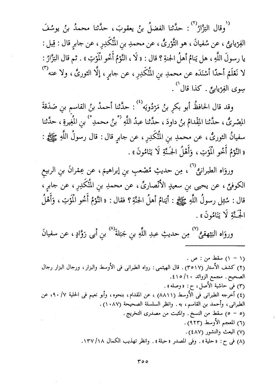 وَقَالَ الْبَزَّارُ: حَدَّثَنَا الْفَضْلُ بْنُ يَعْقُوبَ، حَدَّثَنَا مُحَمَّدُ بْنُ يُوسُفَ الْفِرْيَابِيُّ، عَنْ سُفْيَانَ، هُوَ الثَّوْرِيُّ، عَنْ مُحَمَّدِ بْنِ الْمُنْكَدِرِ، عَنْ جَابِرٍ قَالَ: «قِيلَ: يَا رَسُولَ اللَّهِ، هَلْ يَنَامُ أَهْلُ الْجَنَّةِ؟ قَالَ: " لَا، النَّوْمُ أَخُو الْمَوْتِ» ". ثُمَّ قَالَ الْبَزَّارُ: لَا نَعْلَمُ أَحَدًا أَسْنَدَهُ عَنْ مُحَمَّدِ بْنِ الْمُنْكَدِرِ، عَنْ جَابِرٍ، إِلَّا الثَّوْرِيَّ، وَلَا عَنْهُ سِوَى الْفِرْيَابِيِّ. كَذَا قَالَ.