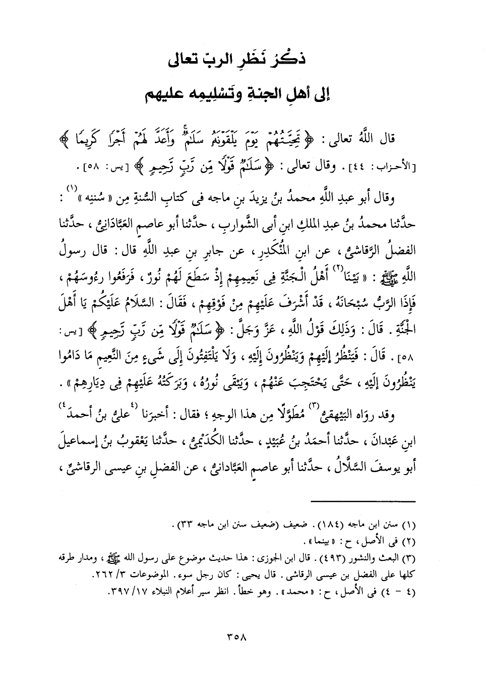قَالَ اللَّهُ تَعَالَى: {تَحِيَّتُهُمْ يَوْمَ يَلْقَوْنَهُ سَلَامٌ وَأَعَدَّ لَهُمْ أَجْرًا كَرِيمًا} [الأحزاب: 44] . وَقَالَ تَعَالَى: {سَلَامٌ قَوْلًا مِنْ رَبٍّ رَحِيمٍ} [يس: 58] . وَقَالَ أَبُو عَبْدِ اللَّهِ مُحَمَّدُ بْنُ يَزِيدَ بْنِ مَاجَهْ فِي كِتَابِ السُّنَّةِ مِنْ " سُنَنِهِ ": حَدَّثَنَا مُحَمَّدُ بْنُ عَبْدِ الْمَلِكِ بْنِ أَبِي الشَّوَارِبِ، حَدَّثَنَا أَبُو عَاصِمٍ الْعَبَّادَانِيُّ، حَدَّثَنَا الْفَضْلُ الرَّقَاشِيُّ، عَنِ ابْنِ الْمُنْكَدِرِ، عَنْ جَابِرِ بْنِ عَبْدِ اللَّهِ قَالَ: قَالَ رَسُولُ اللَّهِ صَلَّى اللَّهُ عَلَيْهِ وَسَلَّمَ: " «بَيْنَا أَهْلُ الْجَنَّةِ فِي نَعِيمِهِمْ إِذْ سَطَعَ لَهُمْ نُورٌ، فَرَفَعُوا رُءُوسَهُمْ، فَإِذَا الرَّبُّ سُبْحَانَهُ، قَدْ أَشْرَفَ عَلَيْهِمْ مِنْ فَوْقِهِمْ، فَقَالَ: السَّلَامُ عَلَيْكُمْ يَا أَهْلَ الْجَنَّةِ. قَالَ: وَذَلِكَ قَوْلُ اللَّهِ عَزَّ وَجَلَّ: {سَلَامٌ قَوْلًا مِنْ رَبٍّ رَحِيمٍ} [يس: 58] . قَالَ: فَيَنْظُرُ إِلَيْهِمْ وَيَنْظُرُونَ إِلَيْهِ، وَلَا يَلْتَفِتُونَ إِلَى شَيْءٍ مِنَ النَّعِيمِ مَا دَامُوا يَنْظُرُونَ إِلَيْهِ، حَتَّى يَحْتَجِبَ عَنْهُمْ، وَيَبْقَى نُورُهُ، وَبَرَكَتُهُ عَلَيْهِمْ فِي دِيَارِهِمْ» ".