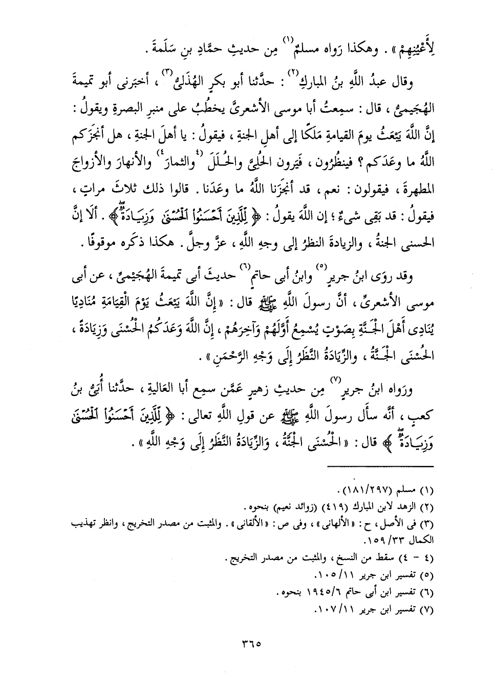 وَقَدْ رَوَى ابْنُ جَرِيرٍ وَابْنُ أَبِي حَاتِمٍ حَدِيثَ أَبِي تَمِيمَةَ الْهُجَيْمِيِّ، عَنْ أَبِي مُوسَى الْأَشْعَرِيِّ، أَنَّ رَسُولَ اللَّهِ صَلَّى اللَّهُ عَلَيْهِ وَسَلَّمَ قَالَ: " «إِنَّ اللَّهَ يَبْعَثُ يَوْمَ الْقِيَامَةِ مُنَادِيَا يُنَادِي أَهْلَ الْجَنَّةِ بِصَوْتٍ يُسْمِعُ أَوَّلَهُمْ وَآخِرَهُمْ، إِنَّ اللَّهَ وَعَدَكُمُ الْحُسْنَى وَزِيَادَةً، الْحُسْنَى الْجَنَّةُ، وَالزِّيَادَةُ النَّظَرُ إِلَى وَجْهِ الرَّحْمَنِ» ".