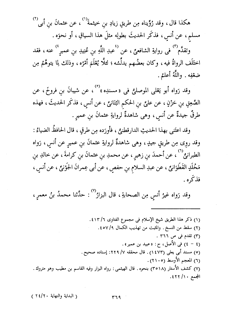 وَقَدْ رَوَاهُ أَبُو يَعْلَى الْمَوْصِلِيُّ فِي " مُسْنَدِهِ "، عَنْ شَيْبَانَ بْنِ فَرُّوخَ، عَنِ الصَّعِقِ بْنِ حَزْنٍ، عَنْ عَلِيِّ بْنِ الْحَكَمِ الْبُنَانِيِّ، عَنْ أَنَسٍ، فَذَكَرَ الْحَدِيثَ، فَهَذِهِ طُرُقٌ جَيِّدَةٌ عَنْ أَنَسٍ، وَهَيَ شَاهِدَةٌ لِرِوَايَةِ عُثْمَانَ بْنِ عُمَيْرٍ.