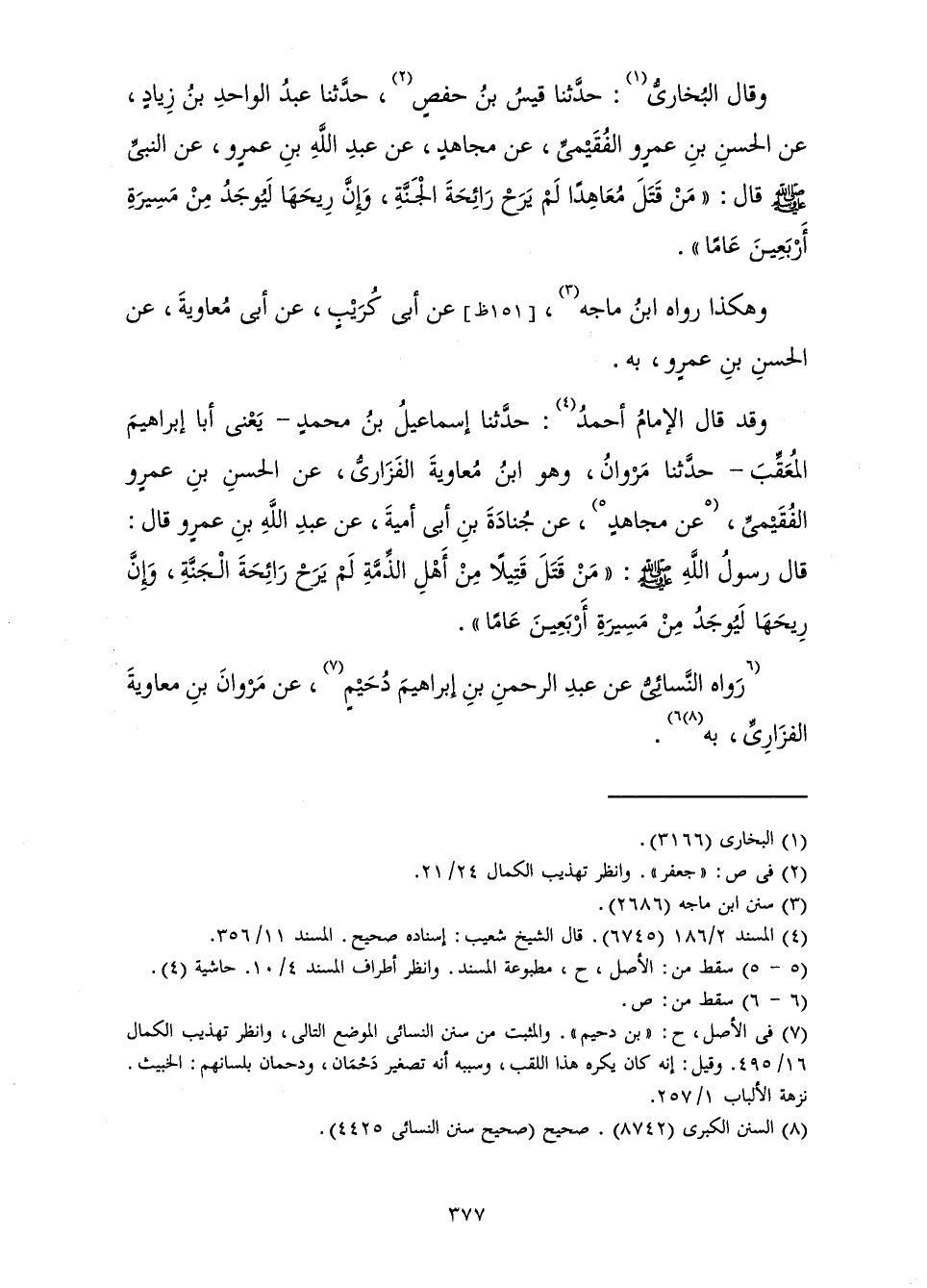 وَقَالَ الْبُخَارِيُّ: حَدَّثَنَا قَيْسُ بْنُ حَفْصٍ، حَدَّثَنَا عَبْدُ الْوَاحِدِ بْنُ زِيَادٍ، عَنِ الْحَسَنِ بْنِ عَمْرٍو الْفُقَيْمِيِّ، عَنْ مُجَاهِدٍ، عَنْ عَبْدِ اللَّهِ بْنِ عَمْرٍو، عَنِ النَّبِيِّ صَلَّى اللَّهُ عَلَيْهِ وَسَلَّمَ قَالَ: " «مَنْ قَتَلَ مُعَاهِدًا لَمْ يَرَحْ رَائِحَةَ الْجَنَّةِ، وَإِنَّ رِيحَهَا لَيُوجَدُ مِنْ مَسِيرَةِ أَرْبَعِينَ عَامًا» ".