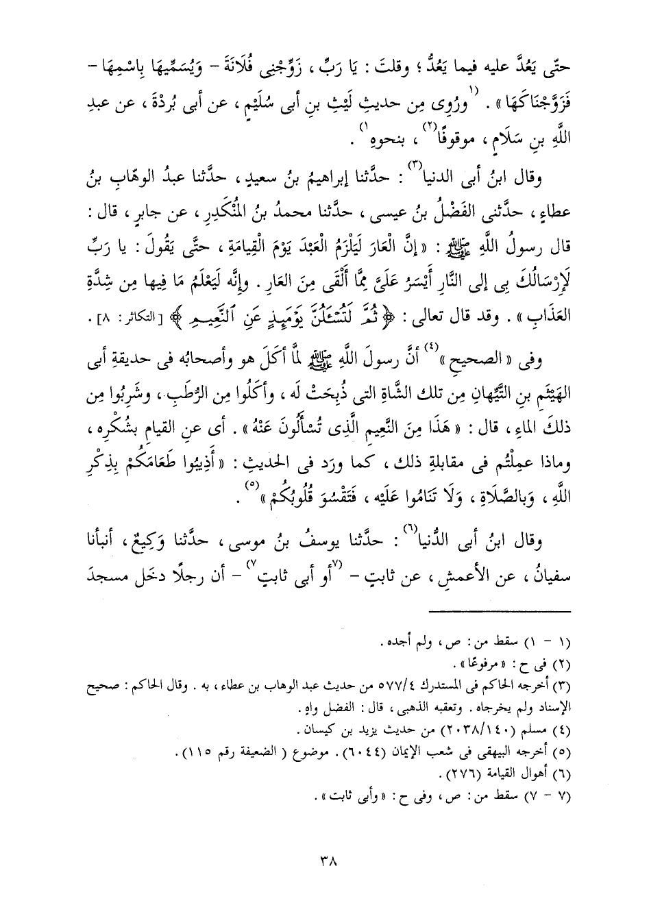 حَتَّى يَعُدَّ عَلَيْهِ فِيمَا يَعُدُّ ; وَقُلْتَ: يَا رَبِّ، زَوِّجْنِي فُلَانَةً - وَيُسَمِّيهَا بِاسْمِهَا - فَزَوَّجْنَاكَهَا» ". وَرُوِيَ مِنْ حَدِيثِ لَيْثِ بْنِ أَبِي سُلَيْمٍ، عَنْ أَبِي بُرْدَةَ، عَنْ عَبْدِ اللَّهِ بْنِ سَلَامٍ، مَوْقُوفًا، بِنَحْوِهِ.
