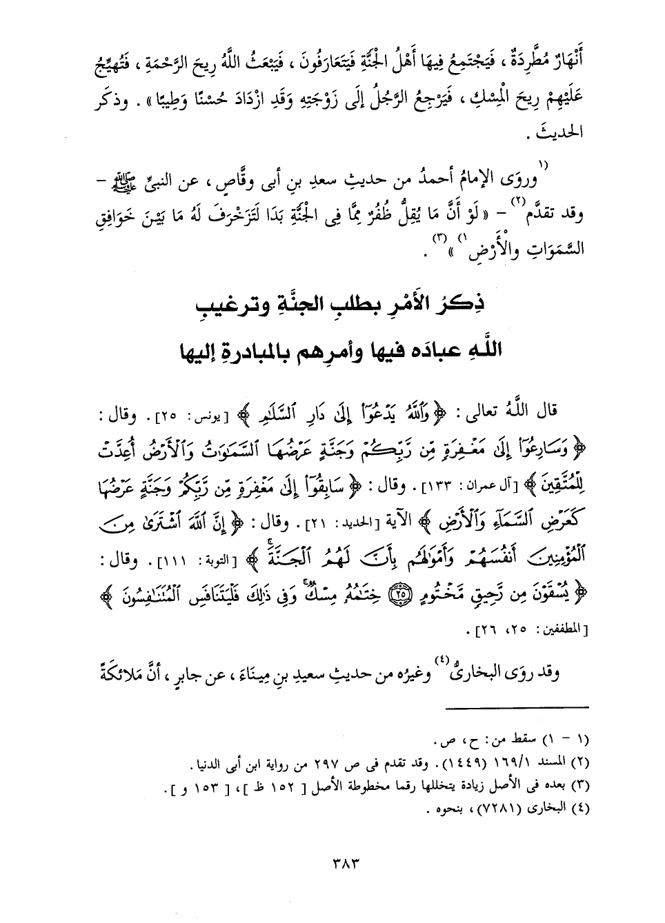 قَالَ اللَّهُ تَعَالَى: {وَاللَّهُ يَدْعُو إِلَى دَارِ السَّلَامِ} [يونس: 25] يُونُسَ: 25] . وَقَالَ: {وَسَارِعُوا إِلَى مَغْفِرَةٍ مِنْ رَبِّكُمْ وَجَنَّةٍ عَرْضُهَا السَّمَاوَاتُ وَالْأَرْضُ أُعِدَّتْ لِلْمُتَّقِينَ} [آل عمران: 133] . وَقَالَ: {سَابِقُوا إِلَى مَغْفِرَةٍ مِنْ رَبِّكُمْ وَجَنَّةٍ عَرْضُهَا كَعَرْضِ السَّمَاءِ وَالْأَرْضِ} [الحديد: 21] الْآيَةَ [الْحَدِيدِ: 21] . وَقَالَ: {إِنَّ اللَّهَ اشْتَرَى مِنَ الْمُؤْمِنِينَ أَنْفُسَهُمْ وَأَمْوَالَهُمْ بِأَنَّ لَهُمُ الْجَنَّةَ} [التوبة: 111] . وَقَالَ: {يُسْقَوْنَ مِنْ رَحِيقٍ مَخْتُومٍ خِتَامُهُ مِسْكٌ وَفِي ذَلِكَ فَلْيَتَنَافَسِ الْمُتَنَافِسُونَ} [المطففين: 25]