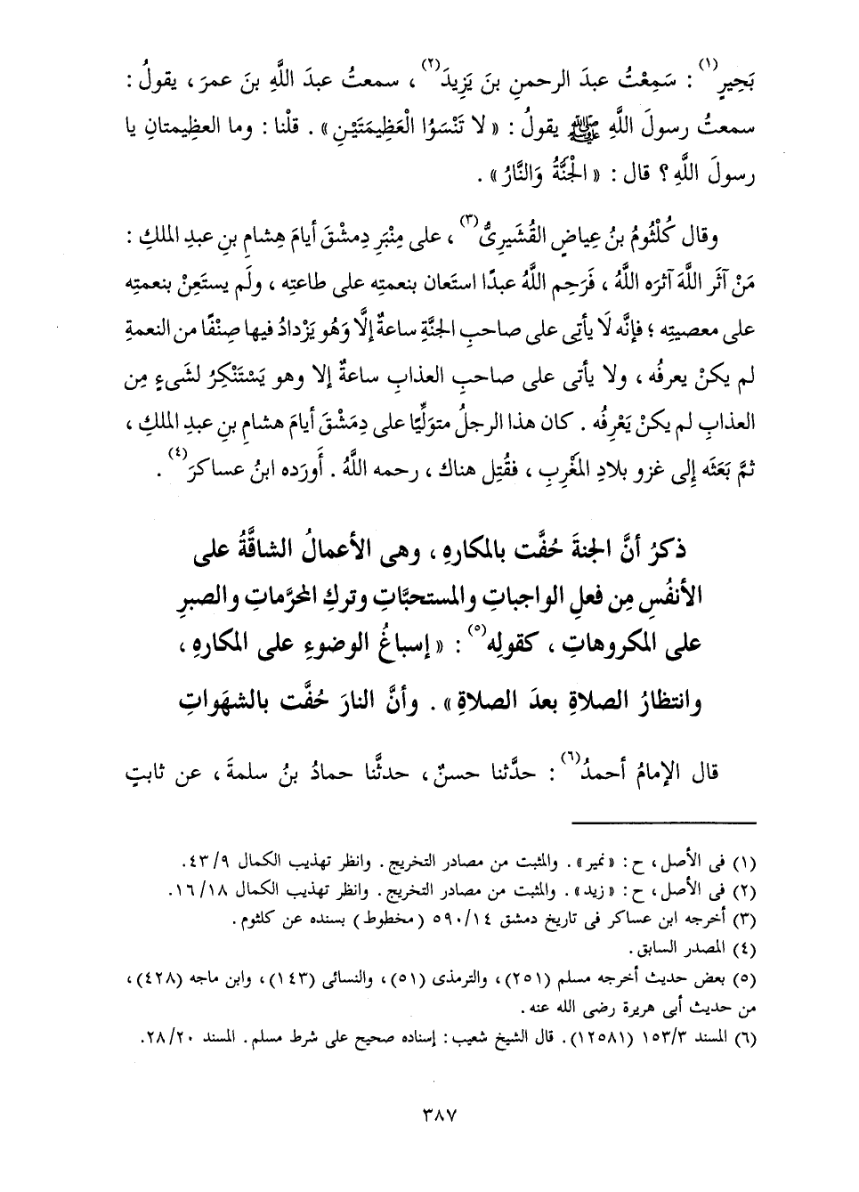 بَحِيرٍ: سَمِعْتُ عَبْدَ الرَّحْمَنِ بْنَ يَزِيدَ، سَمِعْتُ عَبْدَ اللَّهِ بْنَ عُمَرَ، يَقُولُ: سَمِعْتُ رَسُولَ اللَّهِ صَلَّى اللَّهُ عَلَيْهِ وَسَلَّمَ يَقُولُ: " «لَا تَنْسَوُا الْعَظِيمَتَيْنِ ". قُلْنَا: وَمَا الْعَظِيمَتَانِ يَا رَسُولَ اللَّهِ؟ قَالَ: " الْجَنَّةُ وَالنَّارُ» ".