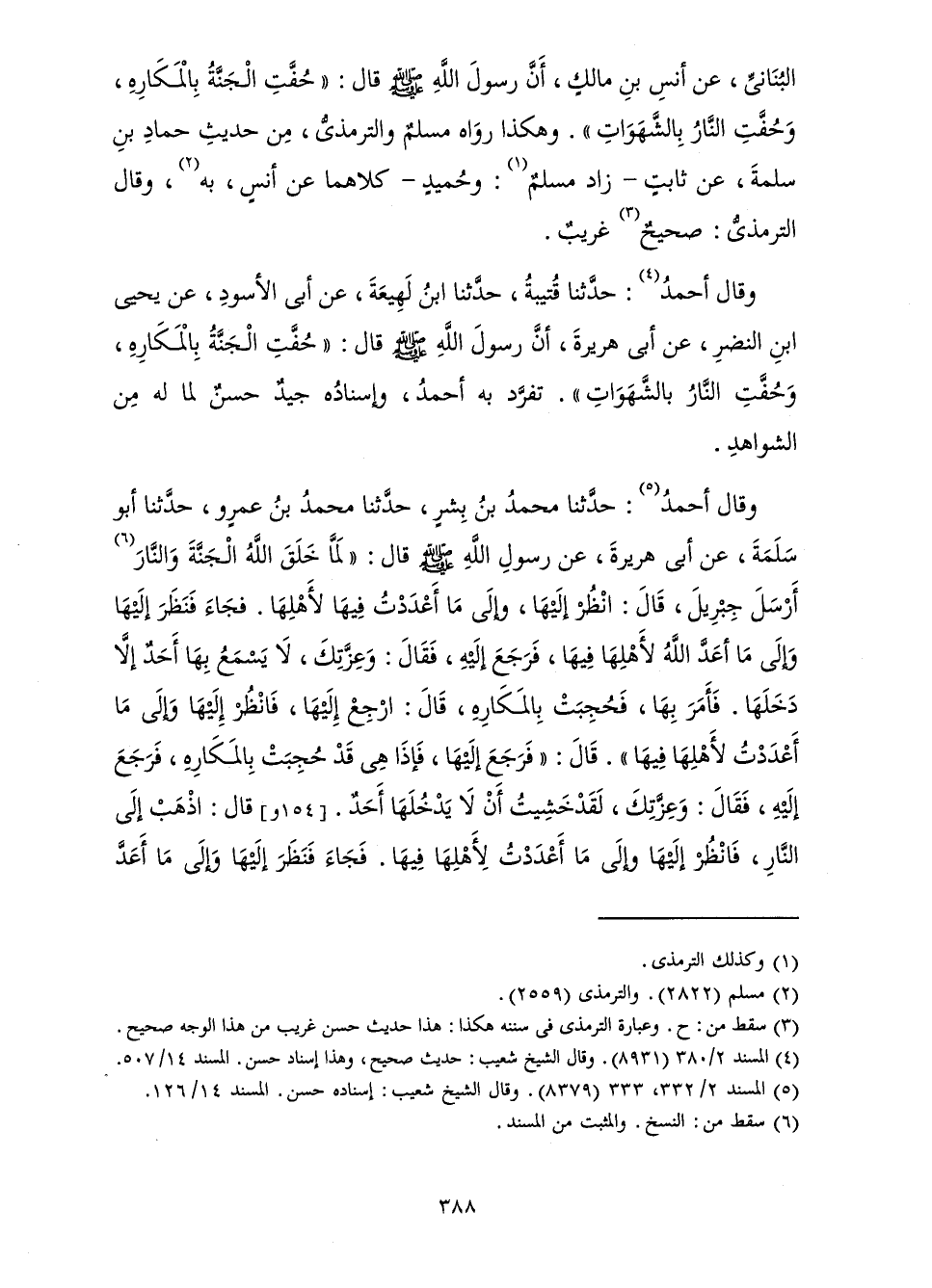الْبُنَانِيِّ، عَنْ أَنَسِ بْنِ مَالِكٍ، أَنَّ رَسُولَ اللَّهِ صَلَّى اللَّهُ عَلَيْهِ وَسَلَّمَ قَالَ: " «حُفَّتِ الْجَنَّةُ بِالْمَكَارِهِ، وَحُفَّتِ النَّارُ بِالشَّهَوَاتِ» ". وَهَكَذَا رَوَاهُ مُسْلِمٌ وَالتِّرْمِذِيُّ، مِنْ حَدِيثِ حَمَّادِ بْنِ سَلَمَةَ، عَنْ ثَابِتٍ - زَادَ مُسْلِمٌ: وَحُمَيْدٌ - كِلَاهُمَا عَنْ أَنَسٍ، بِهِ، وَقَالَ التِّرْمِذِيُّ: صَحِيحٌ غَرِيبٌ.