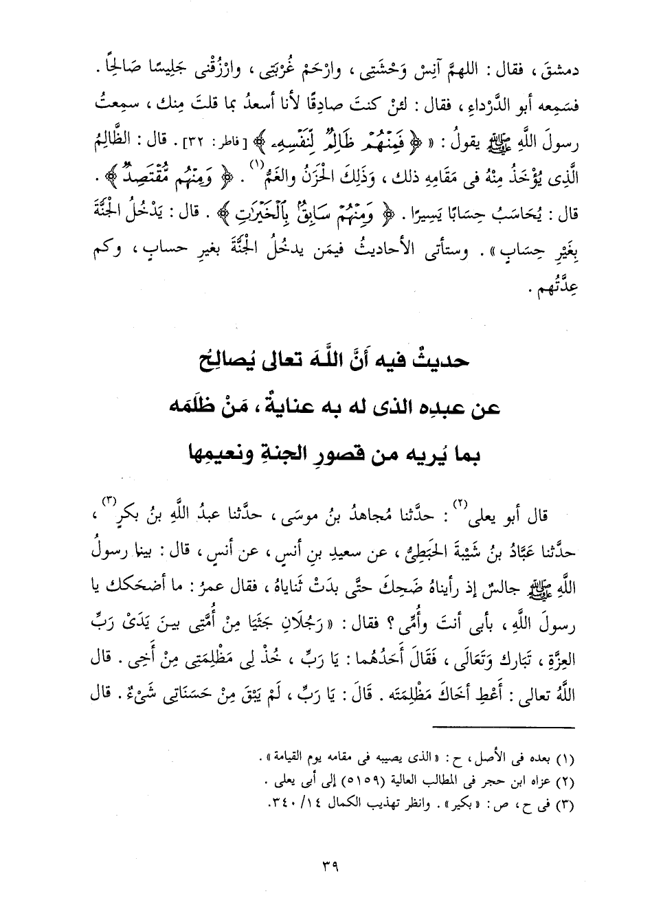 دِمَشْقَ، فَقَالَ: اللَّهُمَّ آنِسْ وَحْشَتِي، وَارْحَمْ غُرْبَتِي، وَارْزُقْنِي جَلِيسًا صَالِحًا. فَسَمِعَهُ أَبُو الدَّرْدَاءِ، فَقَالَ: لَئِنْ كُنْتَ صَادِقًا لَأَنَا أَسْعَدُ بِمَا قُلْتَ مِنْكَ، سَمِعْتُ رَسُولَ اللَّهِ صَلَّى اللَّهُ عَلَيْهِ وَسَلَّمَ يَقُولُ: « {فَمِنْهُمْ ظَالِمٌ لِنَفْسِهِ} [فاطر: 32] . قَالَ: الظَّالِمُ الَّذِي يُؤْخَذُ مِنْهُ فِي مَقَامِهِ ذَلِكَ، وَذَلِكَ الْحَزَنُ وَالْغَمُّ. {وَمِنْهُمْ مُقْتَصِدٌ} [فاطر: 32] . قَالَ: يُحَاسَبُ حِسَابًا يَسِيرًا. {وَمِنْهُمْ سَابِقٌ بِالْخَيْرَاتِ} [فاطر: 32] . قَالَ: يَدْخُلُ الْجَنَّةَ بِغَيْرِ حِسَابٍ» . وَسَتَأْتِي الْأَحَادِيثُ فِيمَنْ يَدْخُلُ الْجَنَّةَ بِغَيْرِ حِسَابٍ، وَكَمْ عِدَّتُهُمْ.
