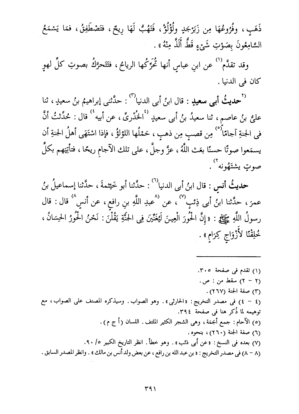 ٍ: قَالَ ابْنُ أَبِي الدُّنْيَا: حَدَّثَنَا أَبُو خَيْثَمَةَ، حَدَّثَنَا إِسْمَاعِيلُ بْنُ عُمَرَ، حَدَّثَنَا ابْنُ أَبِي ذِئْبٍ، عَنْ عَبْدِ اللَّهِ بْنِ رَافِعٍ، عَنْ أَنَسٍ قَالَ: قَالَ رَسُولُ اللَّهِ صَلَّى اللَّهُ عَلَيْهِ وَسَلَّمَ: " «إِنَّ الْحُورَ الْعِينَ لَيُغَنِّينَ فِي الْجَنَّةِ يَقُلْنَ: نَحْنُ الْحُورُ الْحِسَانُ، خُلِقْنَا لِأَزْوَاجٍ كِرَامٍ» ".