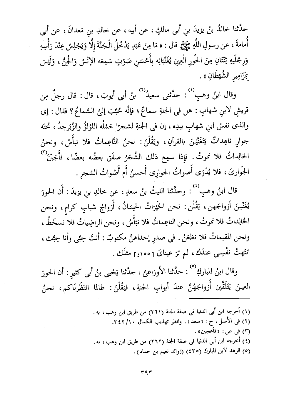 قَالَ ابْنُ وَهْبٍ: وَحَدَّثَنَا اللَّيْثُ بْنُ سَعْدٍ، عَنْ خَالِدِ بْنِ يَزِيدَ: أَنَّ الْحُورَ يُغَنِّينَ أَزْوَاجَهُنَّ، يَقُلْنَ: نَحْنُ الْخَيْرَاتُ الْحِسَانُ، أَزْوَاجُ شَبَابٍ كِرَامٍ، وَنَحْنُ الْخَالِدَاتُ فَلَا نَمُوتُ، وَنَحْنُ النَّاعِمَاتُ فَلَا نَبْأَسُ، وَنَحْنُ الرَّاضِيَاتُ فَلَا نَسْخَطُ، وَنَحْنُ الْمُقِيمَاتُ فَلَا نَظْعَنُ. فِي صَدْرِ إِحْدَاهُنَّ مَكْتُوبٌ: أَنْتَ حِبِّي وَأَنَا حِبُّكَ، انْتَهَتْ نَفْسِي عِنْدَكَ، لَمْ تَرَ عَيْنَايَ مِثْلَكَ.