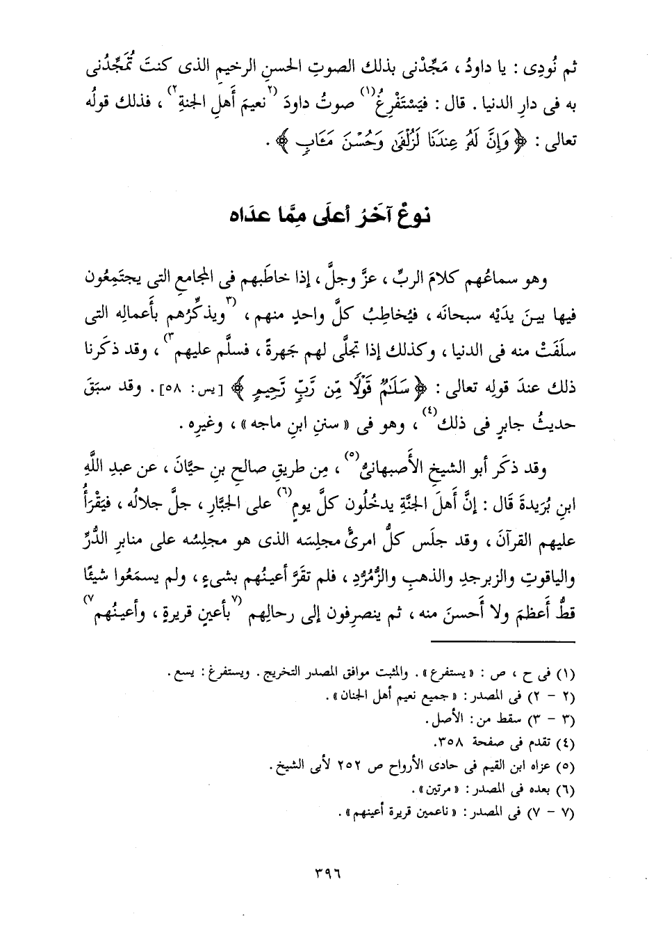 وَهُوَ سَمَاعُهُمْ كَلَامَ الرَّبِّ، عَزَّ وَجَلَّ، إِذَا خَاطَبَهُمْ فِي الْمَجَامِعِ الَّتِي يَجْتَمِعُونَ فِيهَا بَيْنَ يَدَيْهِ سُبْحَانَهُ، فَيُخَاطِبُ كُلَّ وَاحِدٍ مِنْهُمْ، وَيُذَكِّرُهُمْ بِأَعْمَالِهِ الَّتِي سَلَفَتْ مِنْهُ فِي الدُّنْيَا، وَكَذَلِكَ إِذَا تَجَلَّى لَهُمْ جَهْرَةً، فَسَلَّمَ عَلَيْهِمْ، وَقَدْ ذَكَرْنَا ذَلِكَ عِنْدَ قَوْلِهِ تَعَالَى: {سَلَامٌ قَوْلًا مِنْ رَبٍّ رَحِيمٍ} [يس: 58] . وَقَدْ سَبَقَ حَدِيثُ جَابِرٍ فِي ذَلِكَ، وَهُوَ فِي " سُنَنِ ابْنِ مَاجَهْ "، وَغَيْرِهِ.