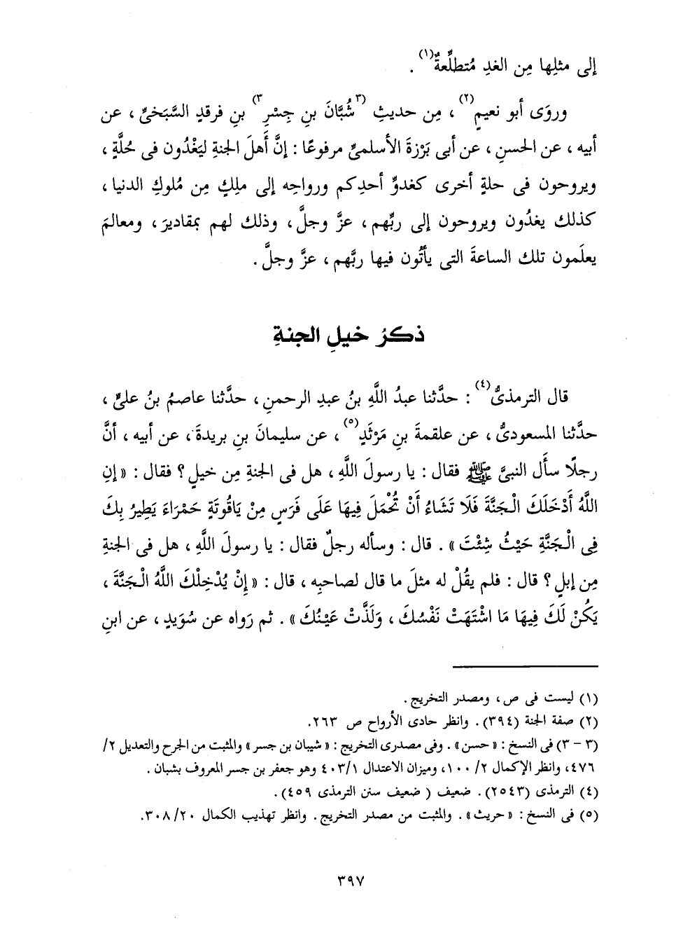 قَالَ التِّرْمِذِيُّ: حَدَّثَنَا عَبْدُ اللَّهِ بْنُ عَبْدِ الرَّحْمَنِ، حَدَّثَنَا عَاصِمُ بْنُ عَلِيٍّ، حَدَّثَنَا الْمَسْعُودِيُّ، عَنْ عَلْقَمَةَ بْنِ مَرْثَدٍ، عَنْ سُلَيْمَانَ بْنِ بُرَيْدَةَ، عَنْ أَبِيهِ، «أَنَّ رَجُلًا سَأَلَ النَّبِيَّ صَلَّى اللَّهُ عَلَيْهِ وَسَلَّمَ فَقَالَ: يَا رَسُولَ اللَّهِ، هَلْ فِي الْجَنَّةِ مِنْ خَيْلٍ؟ فَقَالَ: " إِنِ اللَّهُ أَدْخَلَكَ الْجَنَّةَ فَلَا تَشَاءُ أَنْ تُحْمَلَ فِيهَا عَلَى فَرَسٍ مِنْ يَاقُوتَةٍ حَمْرَاءَ يَطِيرُ بِكَ فِي الْجَنَّةِ حَيْثُ شِئْتَ ". قَالَ: وَسَأَلَهُ رَجُلٌ فَقَالَ: يَا رَسُولَ اللَّهِ، هَلْ فِي الْجَنَّةِ مِنْ إِبِلٍ؟ قَالَ: فَلَمْ يَقُلْ لَهُ مِثْلَ مَا قَالَ لِصَاحِبِهِ، قَالَ: " إِنْ يُدْخِلْكَ اللَّهُ الْجَنَّةَ، يَكُنْ لَكَ فِيهَا مَا اشْتَهَتْ نَفْسُكَ، وَلَذَّتْ عَيْنُكَ ".» ثُمَّ رَوَاهُ عَنْ سُوَيْدٍ، عَنِ ابْنِ
