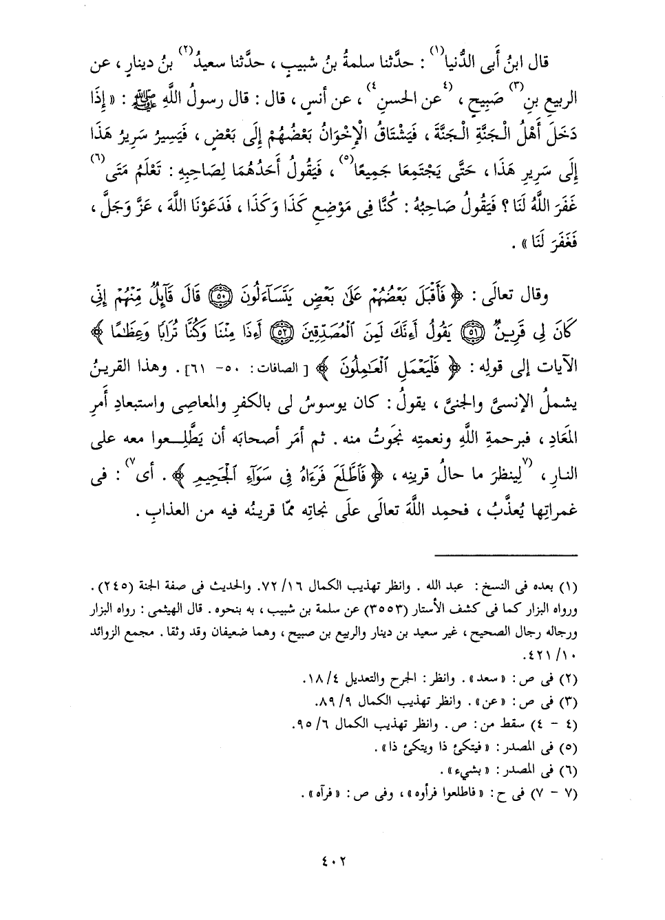 قَالَ ابْنُ أَبِي الدُّنْيَا: حَدَّثَنَا سَلَمَةُ بْنُ شَبِيبٍ، حَدَّثَنَا سَعِيدُ بْنُ دِينَارٍ، عَنِ الرَّبِيعِ بْنِ صَبِيحٍ، عَنِ الْحَسَنِ، عَنْ أَنَسٍ، قَالَ: قَالَ رَسُولُ اللَّهِ صَلَّى اللَّهُ عَلَيْهِ وَسَلَّمَ: " «إِذَا دَخَلَ أَهْلُ الْجَنَّةِ الْجَنَّةَ، فَيَشْتَاقُ الْإِخْوَانُ بَعْضُهُمْ إِلَى بَعْضٍ، فَيَسِيرُ سَرِيرُ هَذَا إِلَى سَرِيرِ هَذَا، حَتَّى يَجْتَمِعَا جَمِيعًا، فَيَقُولُ أَحَدُهُمَا لِصَاحِبِهِ: تَعْلَمُ مَتَى غَفَرَ اللَّهُ لَنَا؟ فَيَقُولُ صَاحِبُهُ: كُنَّا فِي مَوْضِعِ كَذَا وَكَذَا، فَدَعَوْنَا اللَّهَ، عَزَّ وَجَلَّ، فَغَفَرَ لَنَا» ".