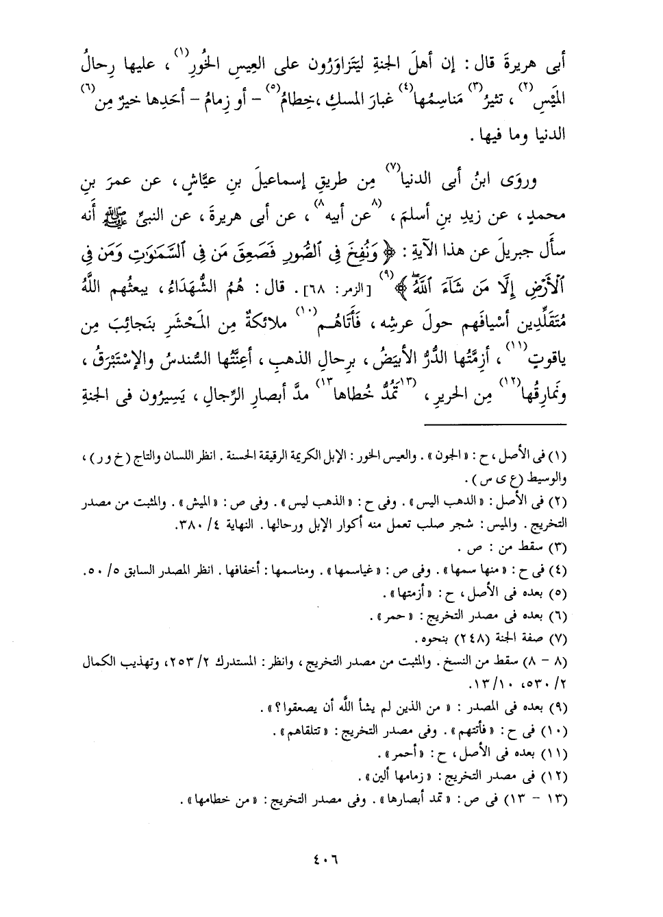 أَبِي هُرَيْرَةَ قَالَ: إِنَّ أَهْلَ الْجَنَّةِ لَيَتَزَاوَرُونَ عَلَى الْعِيسِ الْخُورِ، عَلَيْهَا رِحَالُ الْمَيْسِ، تُثِيرُ مَنَاسِمُهَا غُبَارَ الْمِسْكِ، خِطَامُ أَوْ زِمَامُ - أَحَدِهَا خَيْرٌ مِنَ الدُّنْيَا وَمَا فِيهَا.