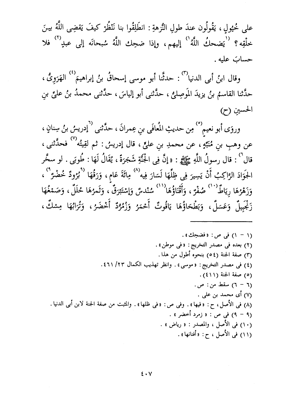 عَلَى خُيُولٍ، يَقُولُونَ عِنْدَ طُولِ النُّزْهَةِ: انْطَلِقُوا بِنَا نَنْظُرْ كَيْفَ يَقْضِي اللَّهُ بَيْنَ خَلْقِهِ؟ يَضْحَكُ اللَّهُ إِلَيْهِمْ، وَإِذَا ضَحِكَ اللَّهُ سُبْحَانَهُ إِلَى عَبْدٍ فَلَا حِسَابَ عَلَيْهِ» .