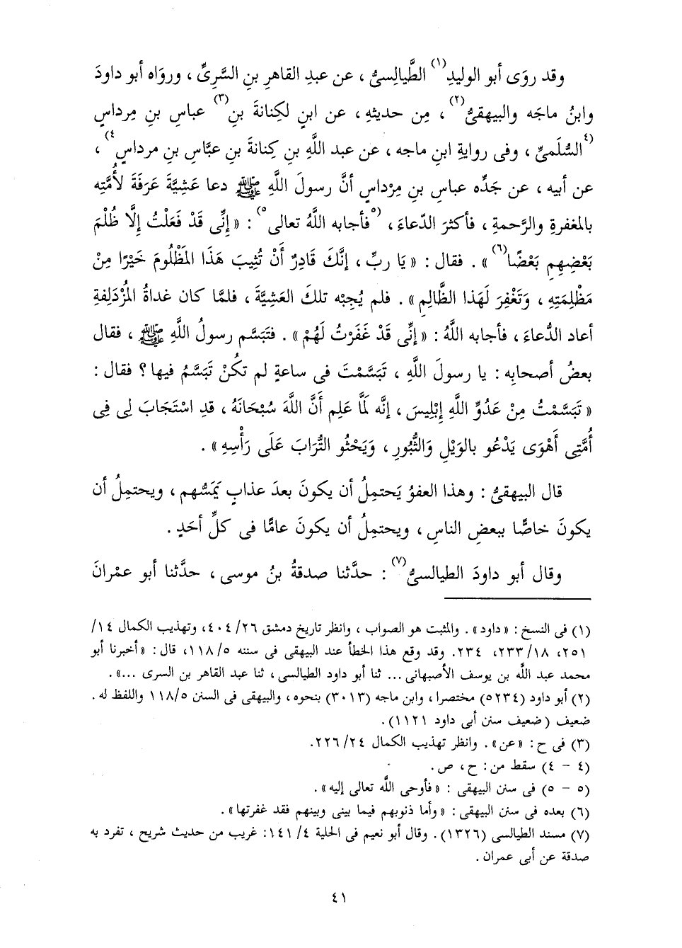 وَقَدْ رَوَى أَبُو الْوَلِيدِ الطَّيَالِسِيُّ، عَنْ عَبْدِ الْقَاهِرِ بْنِ السَّرِيِّ، وَرَوَاهُ أَبُو دَاوُدَ وَابْنُ مَاجَهْ وَالْبَيْهَقِيُّ، مِنْ حَدِيثِهِ، عَنِ ابْنٍ لِكِنَانَةَ بْنِ عَبَّاسِ بْنِ مِرْدَاسٍ السُّلَمِيِّ، وَفِي رِوَايَةِ ابْنِ مَاجَهْ، عَنْ عَبْدِ اللَّهِ بْنِ كِنَانَةَ بْنِ عَبَّاسِ بْنِ مِرْدَاسٍ، عَنْ أَبِيهِ، عَنْ جَدِّهِ عَبَّاسِ بْنِ مِرْدَاسٍ أَنَّ رَسُولَ اللَّهِ صَلَّى اللَّهُ عَلَيْهِ وَسَلَّمَ «دَعَا عَشِيَّةَ عَرَفَةَ لِأُمَّتِهِ بِالْمَغْفِرَةِ وَالرَّحْمَةِ، فَأَكْثَرَ الدُّعَاءَ، فَأَجَابَهُ اللَّهُ تَعَالَى: " إِنِّي قَدْ فَعَلْتُ إِلَّا ظُلْمَ بَعْضِهِمْ بَعْضًا ". فَقَالَ: " يَا رَبِّ، إِنَّكَ قَادِرٌ أَنْ تُثِيبَ هَذَا الْمَظْلُومَ خَيْرًا مِنْ مَظْلَمَتِهِ، وَتَغْفِرَ لِهَذَا الظَّالِمِ ". فَلَمْ يُجِبْهُ تِلْكَ الْعَشِيَّةَ، فَلَمَّا كَانَ غَدَاةُ الْمُزْدَلِفَةِ أَعَادَ الدُّعَاءَ، فَأَجَابَهُ اللَّهُ: " إِنِّي قَدْ غَفَرْتُ لَهُمْ ". فَتَبَسَّمَ رَسُولُ اللَّهِ صَلَّى اللَّهُ عَلَيْهِ وَسَلَّمَ، فَقَالَ بَعْضُ أَصْحَابِهِ: يَا رَسُولَ اللَّهِ، تَبَسَّمْتَ فِي سَاعَةٍ لَمْ تَكُنْ تَبَسَّمُ فِيهَا؟ فَقَالَ: " تَبَسَّمْتُ مِنْ عَدُوِّ اللَّهِ إِبْلِيسَ، إِنَّهُ لَمَّا عَلِمَ أَنَّ اللَّهَ سُبْحَانَهُ، قَدِ اسْتَجَابَ لِي فِي أُمَّتِي أَهْوَى يَدْعُو بِالْوَيْلِ وَالثُّبُورِ، وَيَحْثُو التُّرَابَ عَلَى رَأْسِهِ» ".