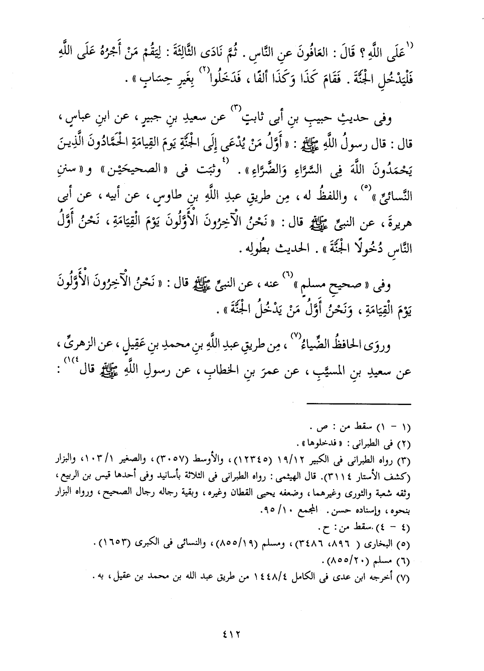 وَفِي حَدِيثِ حَبِيبِ بْنِ أَبِي ثَابِتٍ عَنْ سَعِيدِ بْنِ جُبَيْرٍ، عَنِ ابْنِ عَبَّاسٍ، قَالَ: قَالَ رَسُولُ اللَّهِ صَلَّى اللَّهُ عَلَيْهِ وَسَلَّمَ: " «أَوَّلُ مَنْ يُدْعَى إِلَى الْجَنَّةِ يَوْمَ الْقِيَامَةِ الْحَمَّادُونَ الَّذِينَ يَحْمَدُونَ اللَّهَ فِي السَّرَّاءِ وَالضَّرَّاءِ» ". وَثَبَتَ فِي " الصَّحِيحَيْنِ وَ " سُنَنِ النَّسَائِيِّ "، وَاللَّفْظُ لَهُ، مِنْ طَرِيقِ عَبْدِ اللَّهِ بْنِ طَاوُسٍ، عَنْ أَبِيهِ، عَنْ أَبِي هُرَيْرَةَ، عَنِ النَّبِيِّ صَلَّى اللَّهُ عَلَيْهِ وَسَلَّمَ قَالَ: " «نَحْنُ الْآخِرُونَ الْأَوَّلُونَ يَوْمَ الْقِيَامَةِ، نَحْنُ أَوَّلُ النَّاسِ دُخُولًا الْجَنَّةَ» ". الْحَدِيثَ بِطُولِهِ.