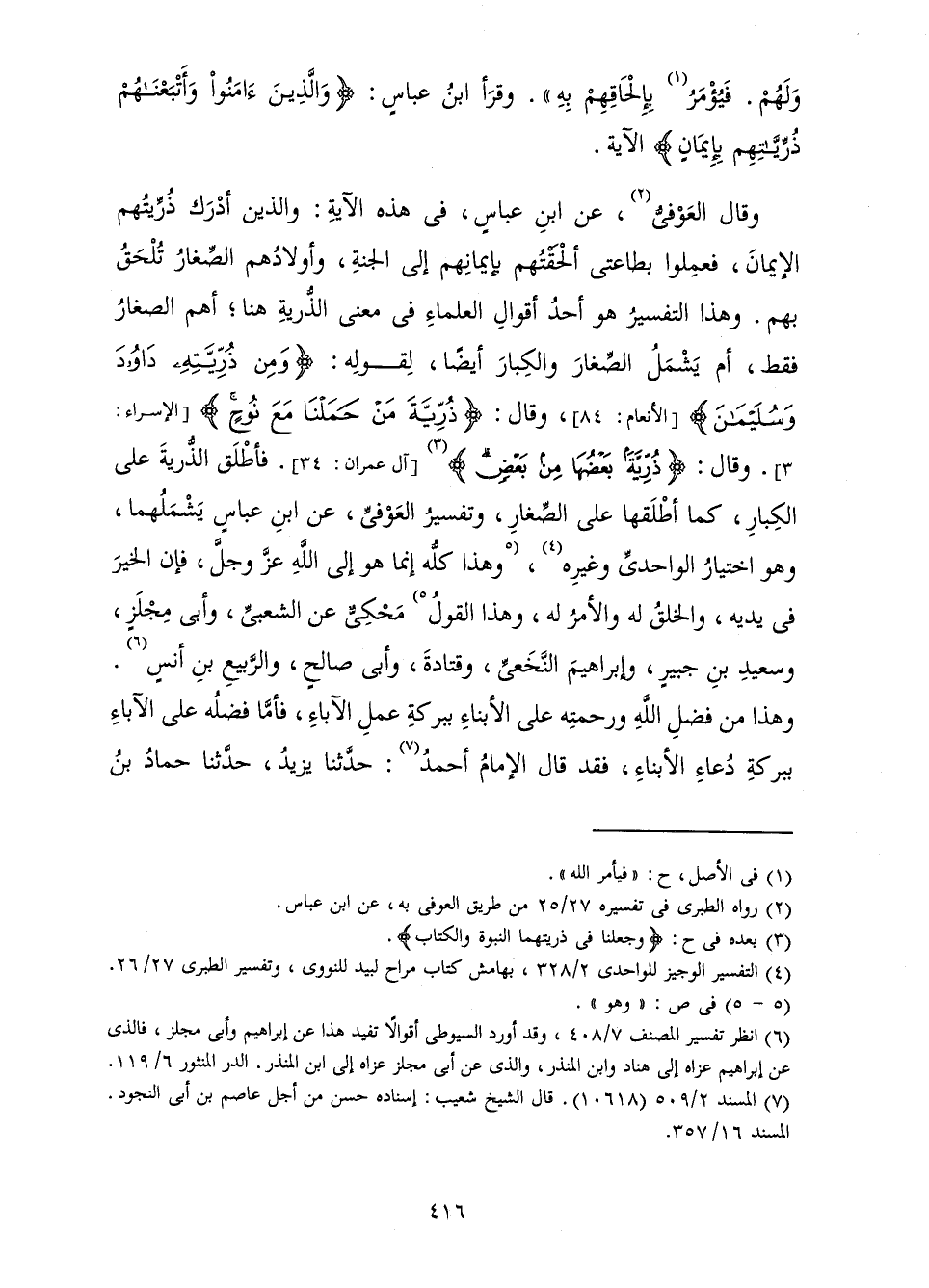 وَقَالَ الْعَوْفِيُّ، عَنِ ابْنِ عَبَّاسٍ، فِي هَذِهِ الْآيَةِ: وَالَّذِينَ أَدْرَكَ ذُرِّيَّتُهُمُ الْإِيمَانَ، فَعَمِلُوا بِطَاعَتِي أَلْحَقْتُهُمْ بِإِيمَانِهِمْ إِلَى الْجَنَّةِ، وَأَوْلَادُهُمُ الصِّغَارُ تُلْحَقُ بِهِمْ. وَهَذَا التَّفْسِيرُ هُوَ أَحَدُ أَقْوَالِ الْعُلَمَاءِ فِي مَعْنَى الذُّرِّيَّةِ هُنَا، أَهُمُ الصِّغَارُ فَقَطْ، أَمْ يَشْمَلُ الصِّغَارَ وَالْكِبَارَ أَيْضًا، لِقَوْلِهِ: {وَمِنْ ذُرِّيَّتِهِ دَاوُدَ وَسُلَيْمَانَ} [الأنعام: 84] ، وَقَالَ: {ذُرِّيَّةَ مَنْ حَمَلْنَا مَعَ نُوحٍ} [الإسراء: 3] ، وَقَالَ: {ذُرِّيَّةً بَعْضُهَا مِنْ بَعْضٍ} [آل عمران: 34] ، فَأَطْلَقَ الذُّرِّيَّةَ عَلَى الْكِبَارِ، كَمَا أَطْلَقَهَا عَلَى الصِّغَارِ، وَتَفْسِيرُ الْعَوْفِيِّ، عَنِ ابْنِ عَبَّاسٍ يَشْمَلُهُمَا، وَهُوَ اخْتِيَارُ الْوَاحِدِيِّ وَغَيْرِهِ، وَهَذَا كُلُّهُ إِنَّمَا هُوَ إِلَى اللَّهِ عَزَّ وَجَلَّ، فَإِنَّ الْخَيْرَ فِي يَدَيْهِ، وَالْخَلْقُ لَهُ وَالْأَمْرُ لَهُ، وَهَذَا الْقَوْلُ مَحْكِيٌّ عَنِ الشَّعْبِيِّ، وَأَبِي مِجْلَزٍ، وَسَعِيدِ بْنِ جُبَيْرٍ، وَإِبْرَاهِيمَ النَّخَعِيِّ، وَقَتَادَةَ، وَأَبِي صَالِحٍ، وَالرَّبِيعِ بْنِ أَنَسٍ. وَهَذَا مِنْ فَضْلِ اللَّهِ وَرَحْمَتِهِ عَلَى الْأَبْنَاءِ بِبَرَكَةِ عَمَلِ الْآبَاءِ، فَأَمَّا فَضْلُهُ عَلَى الْآبَاءِ بِبَرَكَةِ دُعَاءِ الْأَبْنَاءِ، فَقَدْ قَالَ الْإِمَامُ أَحْمَدُ: حَدَّثَنَا يَزِيدُ، حَدَّثَنَا حَمَّادُ بْنُ