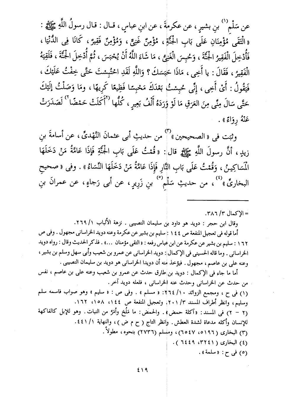 وَثَبَتَ فِي " الصَّحِيحَيْنِ " مِنْ حَدِيثِ أَبِي عُثْمَانَ النَّهْدِيِّ، عَنْ أُسَامَةَ بْنِ زَيْدٍ، أَنَّ رَسُولَ اللَّهِ صَلَّى اللَّهُ عَلَيْهِ وَسَلَّمَ قَالَ: " «قُمْتُ عَلَى بَابِ الْجَنَّةِ فَإِذَا عَامَّةُ مَنْ دَخَلَهَا الْمَسَاكِينُ، وَقُمْتُ عَلَى بَابِ النَّارِ فَإِذَا عَامَّةُ مَنْ دَخَلَهَا النِّسَاءُ» ". وَفِي " صَحِيحِ الْبُخَارِيِّ "، مِنْ حَدِيثِ سَلْمِ بْنِ زَرِيرٍ، عَنْ أَبِي رَجَاءٍ، عَنْ عِمْرَانَ بْنِ