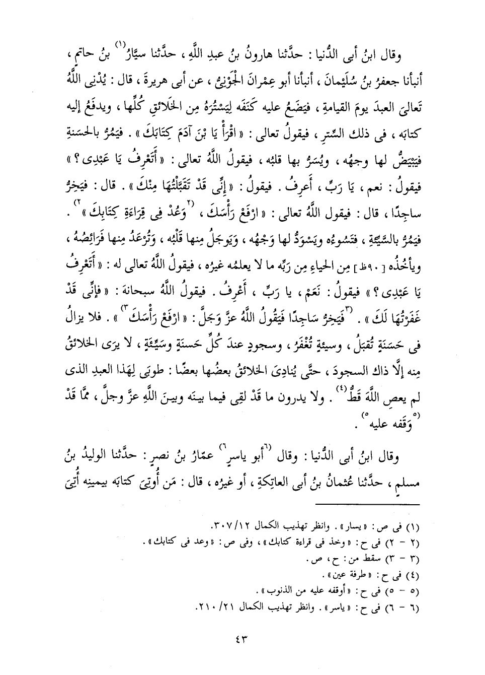 وَقَالَ ابْنُ أَبِي الدُّنْيَا: حَدَّثَنَا هَارُونُ بْنُ عَبْدِ اللَّهِ، حَدَّثَنَا سَيَّارُ بْنُ حَاتِمٍ، أَنْبَأَنَا جَعْفَرُ بْنُ سُلَيْمَانَ، أَنْبَأَنَا أَبُو عِمْرَانَ الْجَوْنِيُّ، عَنْ أَبِي هُرَيْرَةَ، قَالَ: يُدْنِي اللَّهُ تَعَالَى الْعَبْدَ يَوْمَ الْقِيَامَةِ، فَيَضَعُ عَلَيْهِ كَنَفَهُ لِيَسْتُرَهُ مِنَ الْخَلَائِقِ كُلِّهَا، وَيَدْفَعُ إِلَيْهِ كِتَابَهُ، فِي ذَلِكَ السِّتْرِ، فَيَقُولُ تَعَالَى: " اقْرَأْ يَا بْنَ آدَمَ كِتَابَكَ ". فَيَمُرُّ بِالْحَسَنَةِ فَيَبْيَضُّ لَهَا وَجْهُهُ، وَيُسَّرُّ بِهَا قَلْبُهُ، فَيَقُولُ اللَّهُ تَعَالَى: " أَتَعْرِفُ يَا عَبْدِي؟ " فَيَقُولُ: نَعَمْ، يَا رَبِّ، أَعْرِفُ. فَيَقُولُ: " إِنِّي قَدْ تَقَبَّلْتُهَا مِنْكَ ". قَالَ: فَيَخِرُّ سَاجِدًا، قَالَ: فَيَقُولُ اللَّهُ تَعَالَى: " ارْفَعْ رَأْسَكَ، وَعُدْ فِي قِرَاءَةِ كِتَابِكَ. فَيَمُرُّ بِالسَّيِّئَةِ، فَتَسُوءُهُ وَيَسْوَدُّ لَهَا وَجْهُهُ، وَيَوْجَلُ مِنْهَا قَلْبُهُ، وَتُرْعَدُ مِنْهَا فَرَائِصُهُ، وَيَأْخُذُهُ مِنَ الْحَيَاءِ مِنْ رَبِّهِ مَا لَا يَعْلَمُهُ غَيْرُهُ، فَيَقُولُ اللَّهُ تَعَالَى لَهُ: " أَتَعْرِفُ يَا عَبْدِي؟ " فَيَقُولُ: نَعَمْ، يَا رَبِّ، أَعْرِفُ. فَيَقُولُ اللَّهُ سُبْحَانَهُ: " فَإِنِّي قَدْ غَفَرْتُهَا لَكَ ". " فَيَخِرُّ سَاجِدًا فَيَقُولُ اللَّهُ عَزَّ وَجَلَّ: " ارْفَعْ رَأْسَكَ ". فَلَا يَزَالُ فِي حَسَنَةٍ تُقْبَلُ، وَسَيِّئَةٍ تُغْفَرُ، وَسُجُودٍ عِنْدَ كُلِّ حَسَنَةٍ وَسَيِّئَةٍ، لَا يَرَى الْخَلَائِقُ مِنْهُ إِلَّا ذَاكَ السُّجُودَ، حَتَّى يُنَادِيَ الْخَلَائِقُ بَعْضُهَا بَعْضًا: طُوبَى لِهَذَا الْعَبْدِ الَّذِي لَمْ يَعْصِ اللَّهَ قَطُّ. وَلَا يَدْرُونَ مَا قَدْ لَقِيَ فِيمَا بَيْنَهُ وَبَيْنَ اللَّهِ عَزَّ وَجَلَّ، مِمَّا قَدْ وَقَفَهُ عَلَيْهِ.