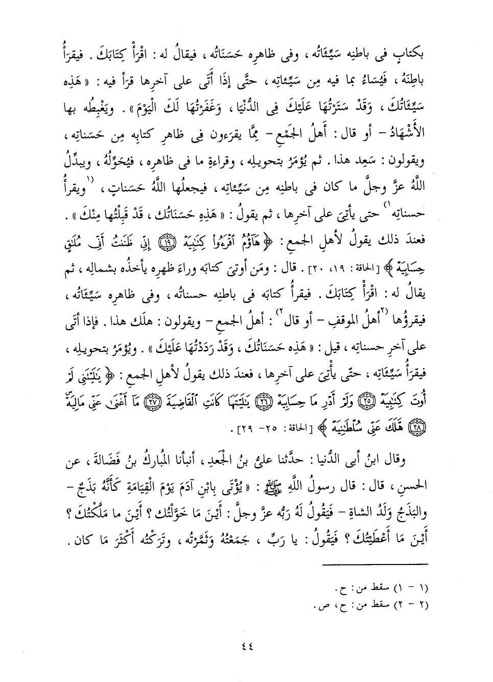 بِكِتَابٍ فِي بَاطِنِهِ سَيِّئَاتُهُ، وَفِي ظَاهِرِهِ حَسَنَاتُهُ، فَيُقَالُ لَهُ: اقْرَأْ كِتَابَكَ. فَيَقْرَأُ بَاطِنَهُ، فَيُسَاءُ بِمَا فِيهِ مِنْ سَيِّئَاتِهِ، حَتَّى إِذَا أَتَى عَلَى آخِرِهَا قَرَأَ فِيهِ: " هَذِهِ سَيِّئَاتُكَ، وَقَدْ سَتَرْتُهَا عَلَيْكَ فِي الدُّنْيَا، وَغَفَرْتُهَا لَكَ الْيَوْمَ ". وَيَغْبِطُهُ بِهَا الْأَشْهَادُ - أَوْ قَالَ: أَهْلُ الْجَمْعِ - مِمَّا يَقْرَءُونَ فِي ظَاهِرِ كِتَابِهِ مِنْ حَسَنَاتِهِ، وَيَقُولُونَ: سَعِدَ هَذَا. ثُمَّ يُؤْمَرُ بِتَحْوِيلِهِ، وَقِرَاءَةِ مَا فِي ظَاهِرِهِ، فَيُحَوِّلُهُ، وَيُبَدِّلُ اللَّهُ عَزَّ وَجَلَّ مَا كَانَ فِي بَاطِنِهِ مِنْ سَيِّئَاتِهِ، فَيَجْعَلُهَا اللَّهُ حَسَنَاتٍ، وَيَقْرَأُ حَسَنَاتَهُ حَتَّى يَأْتِيَ عَلَى آخِرِهَا، ثُمَّ يَقُولُ: " هَذِهِ حَسَنَاتُكَ، قَدْ قَبِلْتُهَا مِنْكَ ". فَعِنْدَ ذَلِكَ يَقُولُ لِأَهْلِ الْجَمْعِ: {هَاؤُمُ اقْرَءُوا كِتَابِيَهْ إِنِّي ظَنَنْتُ أَنِّي مُلَاقٍ حِسَابِيَهْ} [الحاقة: 19]