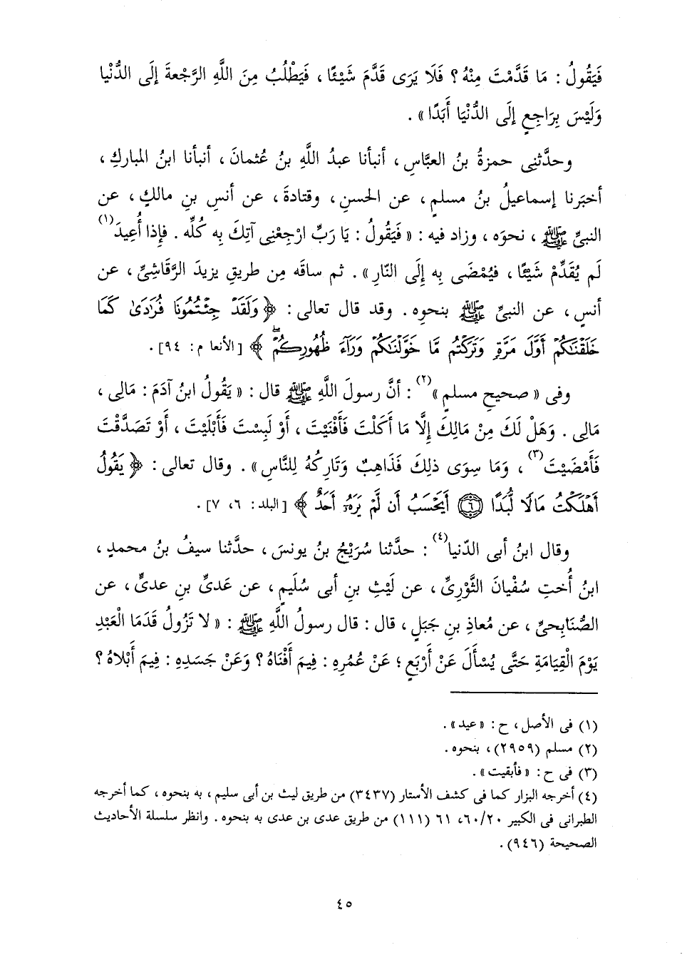وَحَدَّثَنِي حَمْزَةُ بْنُ الْعَبَّاسِ، أَنْبَأَنَا عَبْدُ اللَّهِ بْنُ عُثْمَانَ، أَنْبَأَنَا ابْنُ الْمُبَارَكِ، أَخْبَرَنَا إِسْمَاعِيلُ بْنُ مُسْلِمٍ، عَنِ الْحَسَنِ، وَقَتَادَةَ، عَنْ أَنَسِ بْنِ مَالِكٍ، عَنِ النَّبِيِّ صَلَّى اللَّهُ عَلَيْهِ وَسَلَّمَ، نَحْوَهُ، وَزَادَ فِيهِ: " «فَيَقُولُ: يَا رَبِّ أَرْجِعْنِي آتِكَ بِهِ كُلِّهِ. فَإِذَا أُعِيدَ لَمْ يُقَدِّمْ شَيْئًا، فَيُمْضَى بِهِ إِلَى النَّارِ» ". ثُمَّ سَاقَهُ مِنْ طَرِيقِ يَزِيدَ الرَّقَاشِّيِّ، عَنْ أَنَسٍ، عَنِ النَّبِيِّ صَلَّى اللَّهُ عَلَيْهِ وَسَلَّمَ بِنَحْوِهِ. وَقَدْ قَالَ تَعَالَى: {وَلَقَدْ جِئْتُمُونَا فُرَادَى كَمَا خَلَقْنَاكُمْ أَوَّلَ مَرَّةٍ وَتَرَكْتُمْ مَا خَوَّلْنَاكُمْ وَرَاءَ ظُهُورِكُمْ} [الأنعام: 94] .