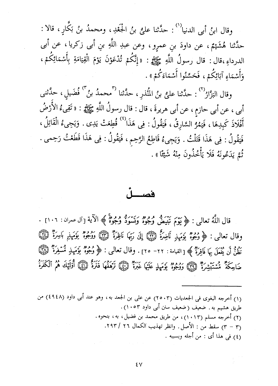 قَالَ اللَّهُ تَعَالَى: {يَوْمَ تَبْيَضُّ وُجُوهٌ وَتَسْوَدُّ وُجُوهٌ} [آل عمران: 106] . وَقَالَ تَعَالَى: {وُجُوهٌ يَوْمَئِذٍ نَاضِرَةٌ إِلَى رَبِّهَا نَاظِرَةٌ وَوُجُوهٌ يَوْمَئِذٍ بَاسِرَةٌ تَظُنُّ أَنْ يُفْعَلَ بِهَا فَاقِرَةٌ} [القيامة: 22]