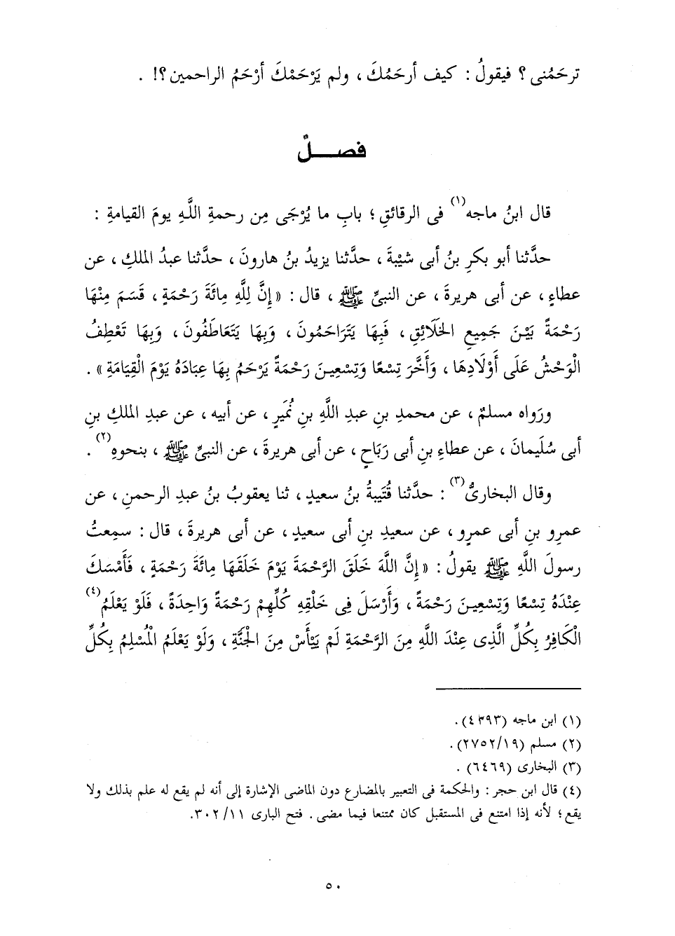 قَالَ ابْنُ مَاجَهْ فِي الرَّقَائِقِ ; بَابِ مَا يُرْجَى مِنْ رَحْمَةِ اللَّهِ يَوْمَ الْقِيَامَةِ: حَدَّثَنَا أَبُو بَكْرِ بْنُ أَبِي شَيْبَةَ، حَدَّثَنَا يَزِيدُ بْنُ هَارُونَ، حَدَّثَنَا عَبْدُ الْمَلِكِ، عَنْ عَطَاءٍ، عَنْ أَبِي هُرَيْرَةَ، عَنِ النَّبِيِّ صَلَّى اللَّهُ عَلَيْهِ وَسَلَّمَ، قَالَ: " «إِنَّ لِلَّهِ مِائَةَ رَحْمَةٍ، قَسَمَ مِنْهَا رَحْمَةً بَيْنَ جَمِيعِ الْخَلَائِقِ، فَبِهَا يَتَرَاحَمُونَ، وَبِهَا يَتَعَاطَفُونَ، وَبِهَا تَعْطِفُ الْوَحْشُ عَلَى أَوْلَادِهَا، وَأَخَّرَ تِسْعًا وَتِسْعِينَ رَحْمَةً يَرْحَمُ بِهَا عِبَادَهُ يَوْمَ الْقِيَامَةِ» ".