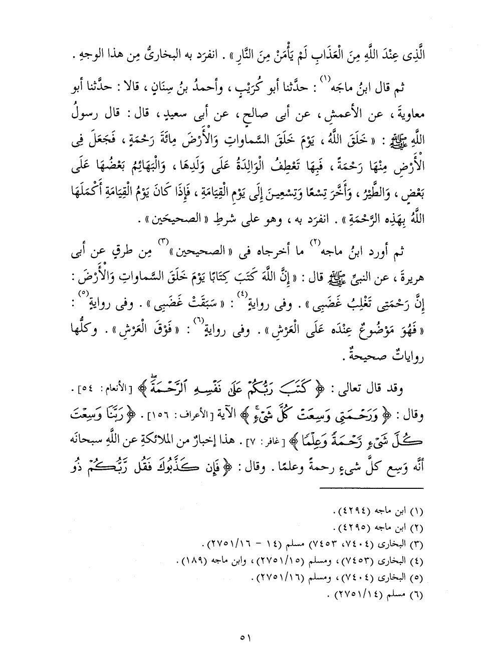 ثُمَّ أَوْرَدَ ابْنُ مَاجَهْ مَا أَخْرَجَاهُ فِي " الصَّحِيحَيْنِ " مِنْ طُرُقٍ عَنْ أَبِي هُرَيْرَةَ، عَنِ النَّبِيِّ صَلَّى اللَّهُ عَلَيْهِ وَسَلَّمَ قَالَ: " «إِنَّ اللَّهَ كَتَبَ كِتَابَا يَوْمَ خَلَقَ السَّمَاوَاتِ وَالْأَرْضَ: إِنَّ رَحْمَتِي تَغْلِبُ غَضَبِي» ". وَفِي رِوَايَةٍ: " سَبَقَتْ غَضَبِي ". وَفِي رِوَايَةٍ: " فَهُوَ مَوْضُوعٌ عِنْدَهُ عَلَى الْعَرْشِ ". وَفِي رِوَايَةٍ: " فَوْقَ الْعَرْشِ ". وَكُلُّهَا رِوَايَاتٌ صَحِيحَةٌ.