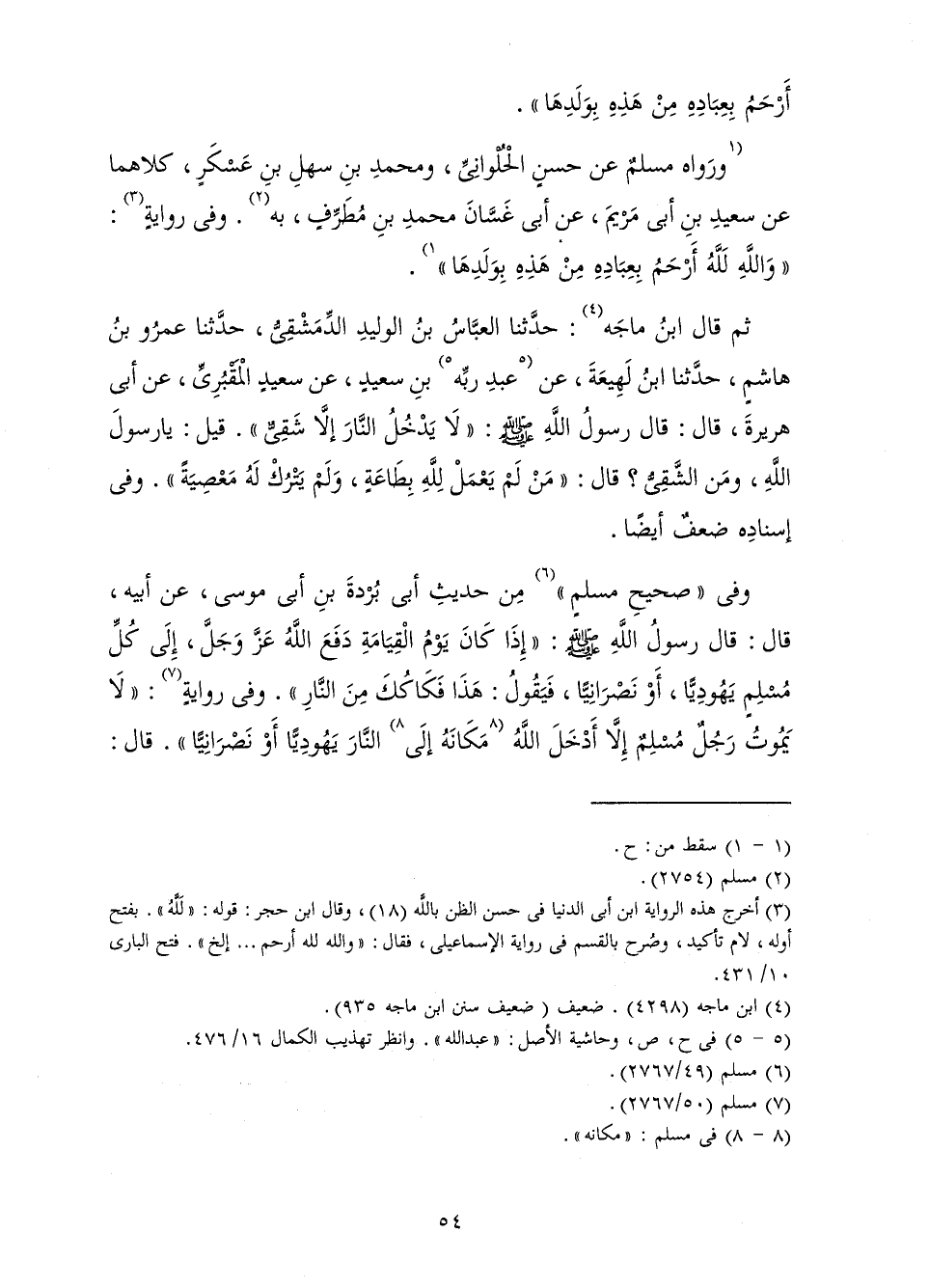 وَرَوَاهُ مُسْلِمٌ عَنْ حَسَنٍ الْحُلْوَانِيِّ، وَمُحَمَّدِ بْنِ سَهْلِ بْنِ عَسْكَرٍ، كِلَاهُمَا عَنْ سَعِيدِ بْنِ أَبِي مَرْيَمَ، عَنْ أَبِي غَسَّانَ مُحَمَّدِ بْنِ مُطَرِّفٍ، بِهِ. وَفِي رِوَايَةٍ: " «وَاللَّهِ لَلَّهُ أَرْحَمُ بِعِبَادِهِ مِنْ هَذِهِ بِوَلَدِهَا» ".