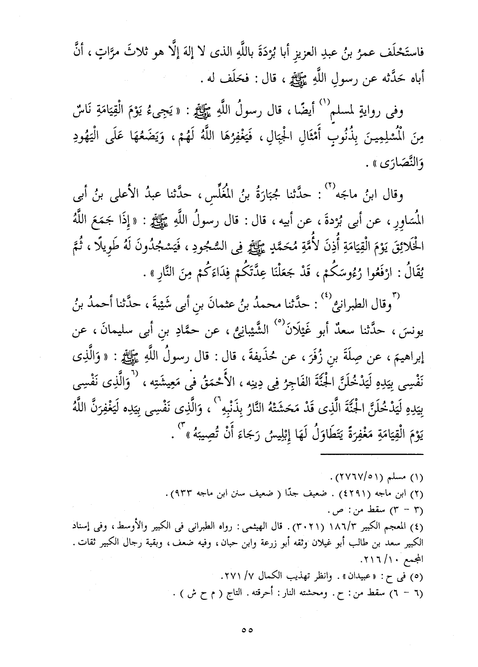 وَقَالَ الطَّبَرَانِيُّ: حَدَّثَنَا مُحَمَّدُ بْنُ عُثْمَانَ بْنِ أَبِي شَيْبَةَ، حَدَّثَنَا أَحْمَدُ بْنُ يُونُسَ، حَدَّثَنَا سَعْدٌ أَبُو غَيْلَانَ الشَّيْبَانِيُّ، عَنْ حَمَّادِ بْنِ أَبِي سُلَيْمَانَ، عَنْ إِبْرَاهِيمَ، عَنْ صِلَةَ بْنِ زُفَرَ، عَنْ حُذَيْفَةَ، قَالَ: قَالَ رَسُولُ اللَّهِ صَلَّى اللَّهُ عَلَيْهِ وَسَلَّمَ: " «وَالَّذِي نَفْسِي بِيَدِهِ لَيَدْخُلَنَّ الْجَنَّةَ الْفَاجِرُ فِي دِينِهِ، الْأَحْمَقُ فِي مَعِيشَتِهِ، وَالَّذِي نَفْسِي بِيَدِهِ لَيَدْخُلَنَّ الْجَنَّةَ الَّذِي قَدْ مَحَشَتْهُ النَّارُ بِذَنْبِهِ، وَالَّذِي نَفْسِي بِيَدِهِ لَيَغْفِرَنَّ اللَّهُ يَوْمَ الْقِيَامَةِ مَغْفِرَةً يَتَطَاوَلُ لَهَا إِبْلِيسُ رَجَاءَ أَنْ تُصِيبَهُ» ".