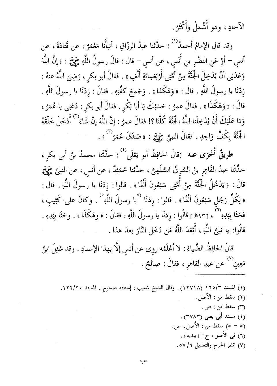 الْآحَادِ، وَهُوَ أَشْمَلُ وَأَكْثَرُ. وَقَدْ قَالَ الْإِمَامُ أَحْمَدُ: حَدَّثَنَا عَبْدُ الرَّزَّاقِ، أَنْبَأَنَا مَعْمَرٌ، عَنْ قَتَادَةَ، عَنْ أَنَسٍ - أَوْ عَنِ النَّضْرِ بْنِ أَنَسٍ، عَنْ أَنَسٍ - قَالَ: قَالَ رَسُولُ اللَّهِ صَلَّى اللَّهُ عَلَيْهِ وَسَلَّمَ: " «إِنَّ اللَّهَ وَعَدَنِي أَنْ يُدْخِلَ الْجَنَّةَ مِنْ أُمَّتِي أَرْبَعَمِائَةِ أَلْفٍ ". فَقَالَ أَبُو بَكْرٍ، رَضِيَ اللَّهُ عَنْهُ: زِدْنَا يَا رَسُولَ اللَّهِ. قَالَ: " وَهَكَذَا ". وَجَمَعَ كَفَّيْهِ. فَقَالَ: زِدْنَا يَا رَسُولَ اللَّهِ. قَالَ: " وَهَكَذَا ". فَقَالَ عُمَرُ: حَسْبُكَ يَا أَبَا بَكْرٍ. فَقَالَ أَبُو بَكْرٍ: دَعْنِي يَا عُمَرُ، وَمَا عَلَيْكَ أَنْ يُدْخِلَنَا اللَّهُ الْجَنَّةَ كُلَّنَا؟! فَقَالَ عُمَرُ: إِنَّ اللَّهَ إِنْ شَاءَ أَدْخَلَ خَلْقَهُ الْجَنَّةَ بِكَفٍّ وَاحِدٍ. فَقَالَ النَّبِيُّ صَلَّى اللَّهُ عَلَيْهِ وَسَلَّمَ: " صَدَقَ عُمَرُ» ".