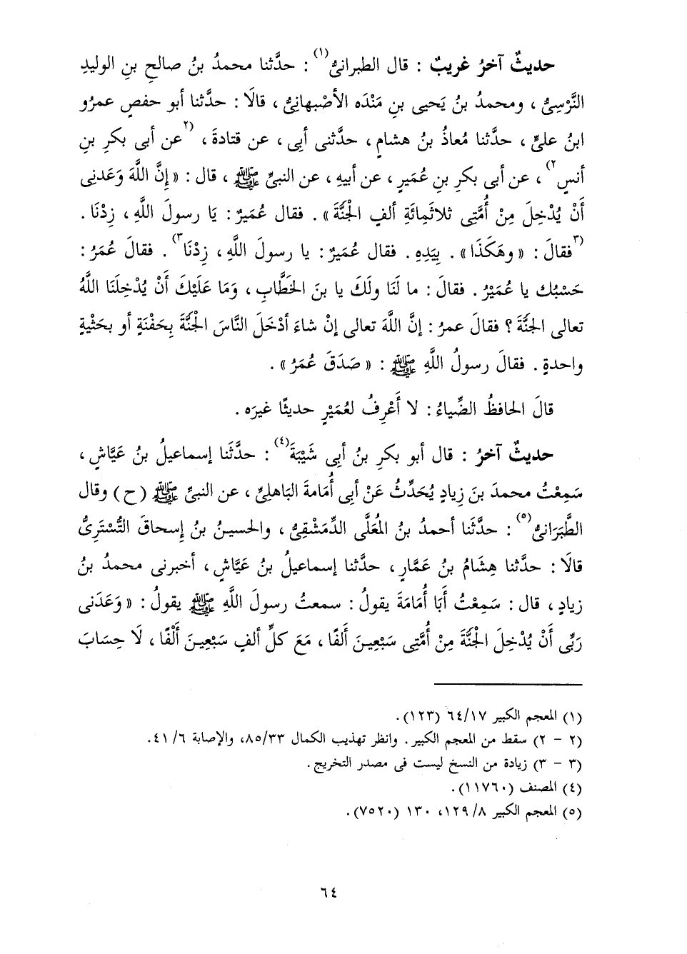 حَدِيثٌ آخَرُ: قَالَ أَبُو بَكْرِ بْنُ أَبِي شَيْبَةَ: حَدَّثَنَا إِسْمَاعِيلُ بْنُ عَيَّاشٍ، سَمِعْتُ مُحَمَّدَ بْنَ زِيَادٍ يُحَدِّثُ عَنْ أَبِي أُمَامَةَ الْبَاهِلِيِّ، عَنِ النَّبِيِّ صَلَّى اللَّهُ عَلَيْهِ وَسَلَّمَ (ح) وَقَالَ الطَّبَرَانِيُّ: حَدَّثَنَا أَحْمَدُ بْنُ الْمُعَلَّى الدِّمَشْقِيُّ، وَالْحُسَيْنُ بْنُ إِسْحَاقَ التُّسْتَرِيُّ قَالَا: حَدَّثَنَا هِشَامُ بْنُ عَمَّارٍ، حَدَّثَنَا إِسْمَاعِيلُ بْنُ عَيَّاشٍ، أَخْبَرَنِي مُحَمَّدُ بْنُ زِيَادٍ، قَالَ: سَمِعْتُ أَبَا أُمَامَةَ يَقُولُ: سَمِعْتُ رَسُولَ اللَّهِ صَلَّى اللَّهُ عَلَيْهِ وَسَلَّمَ يَقُولُ: «وَعَدَنِي رَبِّي أَنْ يُدْخِلَ الْجَنَّةَ مِنْ أُمَّتِي سَبْعِينَ أَلْفًا، مَعَ كُلِّ أَلْفٍ سَبْعِينَ أَلْفًا، لَا حِسَابَ
