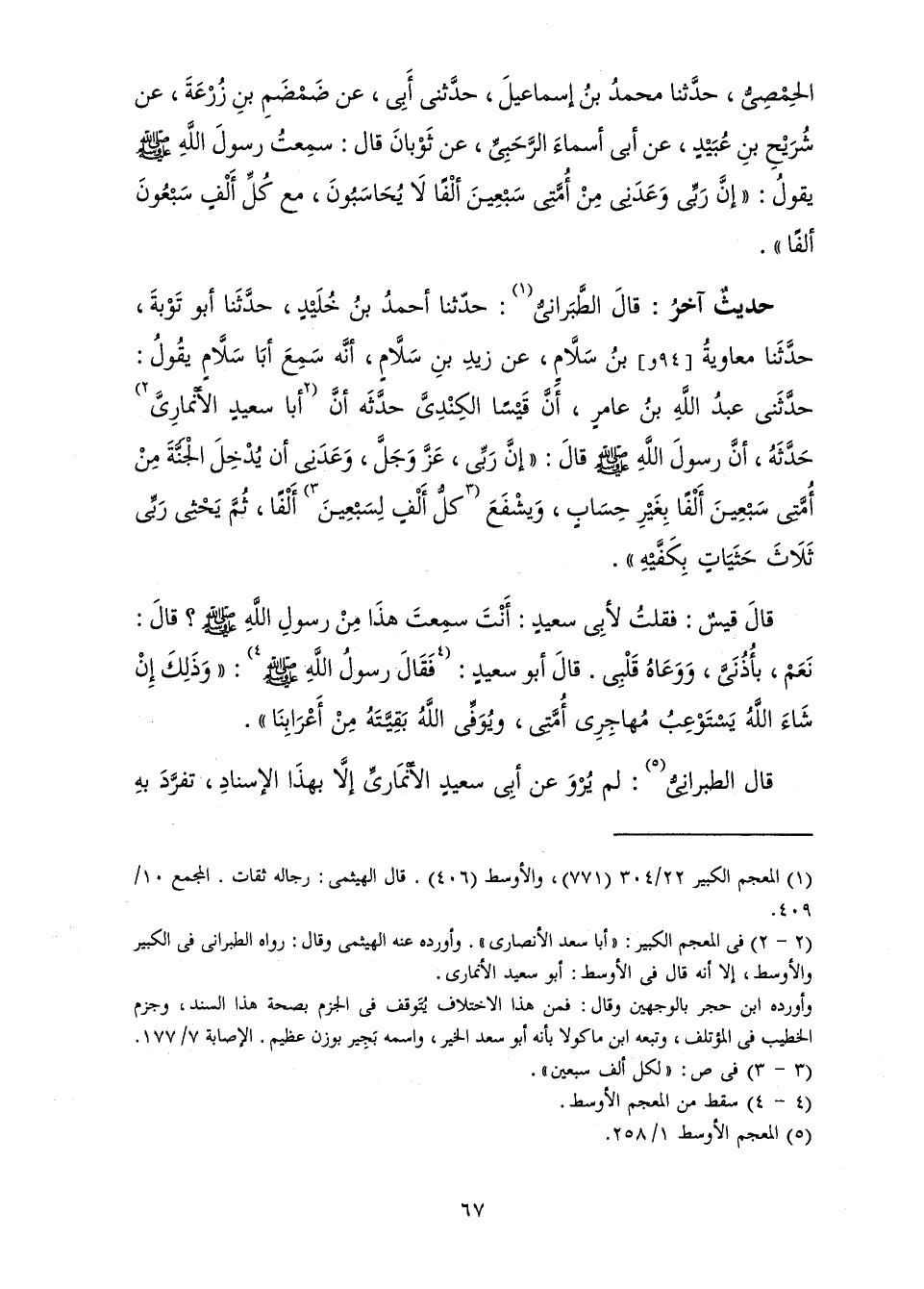 الْحِمْصِيُّ، حَدَّثَنَا مُحَمَّدُ بْنُ إِسْمَاعِيلَ، حَدَّثَنِي أَبِي، عَنْ ضَمْضَمِ بْنِ زُرْعَةَ، عَنْ شُرَيْحِ بْنِ عُبَيْدٍ، عَنْ أَبِي أَسْمَاءَ الرَّحَبِيِّ، عَنْ ثَوْبَانَ قَالَ: سَمِعْتُ رَسُولَ اللَّهِ صَلَّى اللَّهُ عَلَيْهِ وَسَلَّمَ يَقُولُ: " «إِنَّ رَبِّي وَعَدَنِي مِنْ أُمَّتِي سَبْعِينَ أَلْفًا لَا يُحَاسَبُونَ، مَعَ كُلِّ أَلْفٍ سَبْعُونَ أَلْفًا» ".