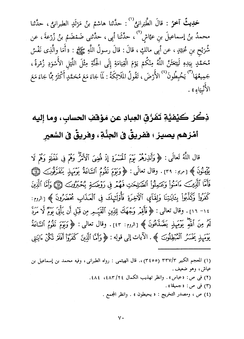حَدِيثٌ آخَرُ: قَالَ الطَّبَرَانِيُّ: حَدَّثَنَا هَاشِمُ بْنُ مَرْثَدٍ الطَّبَرَانِيُّ، حَدَّثَنَا مُحَمَّدُ بْنُ إِسْمَاعِيلَ بْنِ عَيَّاشٍ، حَدَّثَنَا أَبِي، حَدَّثَنِي ضَمْضَمُ بْنُ زُرْعَةَ، عَنْ شُرَيْحِ بْنِ عُبَيْدٍ، عَنْ أَبِي مَالِكٍ، قَالَ: قَالَ رَسُولُ اللَّهِ صَلَّى اللَّهُ عَلَيْهِ وَسَلَّمَ: " «أَمَا وَالَّذِي نَفْسُ مُحَمَّدٍ بِيَدِهِ لَيَبْعَثَنَّ اللَّهُ مِنْكُمْ يَوْمَ الْقِيَامَةِ إِلَى الْجَنَّةِ مِثْلَ اللَّيْلِ الْأَسْوَدِ زُمْرَةً، جَمِيعُهَا يَخْبِطُونَ الْأَرْضَ، تَقُولُ الْمَلَائِكَةُ: لَمَا جَاءَ مَعَ مُحَمَّدٍ أَكْثَرُ مِمَّا جَاءَ مَعَ الْأَنْبِيَاءِ» ".
