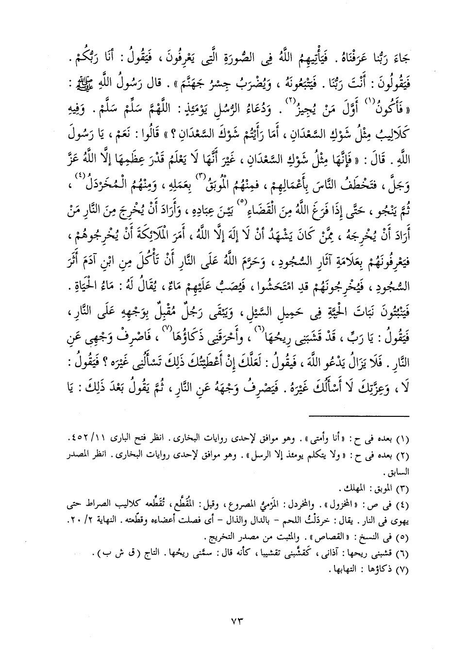 جَاءَ رَبُّنَا عَرَفْنَاهُ. فَيَأْتِيهِمُ اللَّهُ فِي الصُّورَةِ الَّتِي يَعْرِفُونَ، فَيَقُولُ: أَنَا رَبُّكُمْ. فَيَقُولُونَ: أَنْتَ رَبُّنَا. فَيَتْبَعُونَهُ، وَيُضْرَبُ جِسْرُ جَهَنَّمَ ". قَالَ رَسُولُ اللَّهِ صَلَّى اللَّهُ عَلَيْهِ وَسَلَّمَ: " فَأَكُونُ أَوَّلَ مَنْ يُجِيزُ. وَدُعَاءُ الرُّسُلِ يَوْمَئِذٍ: اللَّهُمَّ سَلِّمْ سَلِّمْ. وَفِيهِ كَلَالِيبُ مِثْلُ شَوْكِ السَّعْدَانِ، أَمَّا رَأَيْتُمْ شَوْكَ السَّعْدَانِ؟ " قَالُوا: نَعَمْ، يَا رَسُولَ اللَّهِ. قَالَ: " فَإِنَّهَا مِثْلُ شَوْكِ السَّعْدَانِ، غَيْرَ أَنَّهَا لَا يَعْلَمُ قَدْرَ عِظَمِهَا إِلَّا اللَّهُ عَزَّ وَجَلَّ، فَتَخْطَفُ النَّاسَ بِأَعْمَالِهِمْ، فَمِنْهُمُ الْمُوبَقُ بِعَمَلِهِ، وَمِنْهُمُ الْمُخَرْدَلُ، ثُمَّ يَنْجُو، حَتَّى إِذَا فَرَغَ اللَّهُ مِنَ الْقَضَاءِ بَيْنَ عِبَادِهِ، وَأَرَادَ أَنْ يُخْرِجَ مِنَ النَّارِ مَنْ أَرَادَ أَنْ يُخْرِجَهُ، مِمَّنْ كَانَ يَشْهَدُ أَنْ لَا إِلَهَ إِلَّا اللَّهُ، أَمْرَ الْمَلَائِكَةَ أَنْ يُخْرِجُوهُمْ، فَيَعْرِفُونَهُمْ بِعَلَامَةِ آثَارِ السُّجُودِ، وَحَرَّمَ اللَّهُ عَلَى النَّارِ أَنْ تَأْكُلَ مِنَ ابْنِ آدَمَ أَثَرَ السُّجُودِ، فَيُخْرِجُونَهُمْ قَدِ امْتَحَشُوا، فَيُصَبُّ عَلَيْهِمْ مَاءٌ، يُقَالُ لَهُ: مَاءُ الْحَيَاةِ. فَيَنْبُتُونَ نَبَاتَ الْحَبَّةِ فِي حَمِيلِ السَّيْلِ، وَيَبْقَى رَجُلٌ مُقْبِلٌ بِوَجْهِهِ عَلَى النَّارِ، فَيَقُولُ: يَا رَبِّ، قَدْ قَشَبَنِي رِيحُهَا، وَأَحْرَقَنِي ذَكَاؤُهَا، فَاصْرِفْ وَجْهِي عَنِ النَّارِ. فَلَا يَزَالُ يَدْعُو اللَّهَ، فَيَقُولُ: لَعَلَّكَ إِنْ أَعْطَيْتُكَ ذَلِكَ تَسْأَلُنِي غَيْرَهُ؟ فَيَقُولُ: لَا، وَعِزَّتِكَ لَا أَسْأَلُكَ غَيْرَهُ. فَيَصْرِفُ وَجْهَهُ عَنِ النَّارِ، ثُمَّ يَقُولُ بَعْدَ ذَلِكَ: يَا