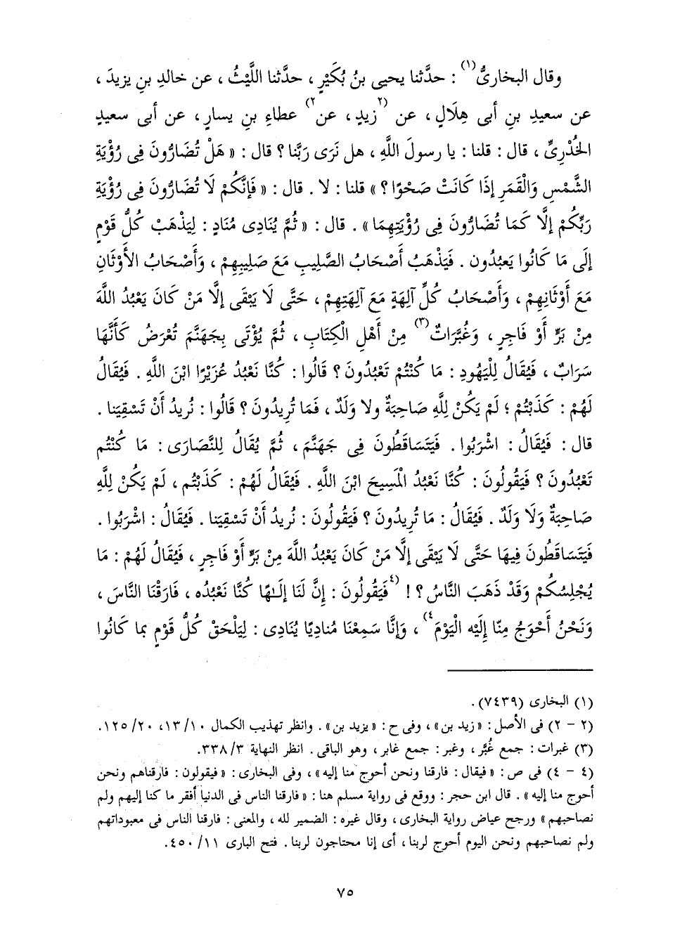وَقَالَ الْبُخَارِيُّ: حَدَّثَنَا يَحْيَى بْنُ بُكَيْرٍ، حَدَّثَنَا اللَّيْثُ، عَنْ خَالِدِ بْنِ يَزِيدَ، عَنْ سَعِيدِ بْنِ أَبِي هِلَالٍ، عَنْ زَيْدٍ، عَنْ عَطَاءِ بْنِ يَسَارٍ، عَنْ أَبِي سَعِيدٍ الْخُدْرِيِّ، قَالَ: «قُلْنَا: يَا رَسُولَ اللَّهِ، هَلْ نَرَى رَبَّنَا؟ قَالَ: " هَلْ تُضَارُّونَ فِي رُؤْيَةِ الشَّمْسِ وَالْقَمَرِ إِذَا كَانَتْ صَحْوًا؟ " قُلْنَا: لَا. قَالَ: " فَإِنَّكُمْ لَا تُضَارُّونَ فِي رُؤْيَةِ رَبِّكُمْ إِلَّا كَمَا تُضَارُّونَ فِي رُؤْيَتِهِمَا ". قَالَ: " ثُمَّ يُنَادِي مُنَادٍ: لِيَذْهَبْ كُلُّ قَوْمٍ إِلَى مَا كَانُوا يَعْبُدُونَ. فَيَذْهَبُ أَصْحَابُ الصَّلِيبِ مَعَ صَلِيبِهِمْ، وَأَصْحَابُ الْأَوْثَانِ مَعَ أَوْثَانِهِمْ، وَأَصْحَابُ كُلِّ آلِهَةٍ مَعَ آلِهَتِهِمْ، حَتَّى لَا يَبْقَى إِلَّا مَنْ كَانَ يَعْبُدُ اللَّهَ مِنْ بَرٍّ أَوْ فَاجِرٍ، وَغُبَّرَاتٌ مِنْ أَهْلِ الْكِتَابِ، ثُمَّ يُؤْتَى بِجَهَنَّمَ تُعْرَضُ كَأَنَّهَا سَرَابٌ، فَيُقَالُ لِلْيَهُودِ: مَا كُنْتُمْ تَعْبُدُونَ؟ قَالُوا: كُنَّا نَعْبُدُ عُزَيْرًا ابْنَ اللَّهِ. فَيُقَالُ لَهُمْ: كَذَبْتُمْ ; لَمْ يَكُنْ لِلَّهِ صَاحِبَةٌ وَلَا وَلَدٌ، فَمَا تُرِيدُونَ؟ قَالُوا: نُرِيدُ أَنْ تَسْقِيَنَا. قَالَ: فَيُقَالُ: اشْرَبُوا. فَيَتَسَاقَطُونَ فِي جَهَنَّمَ، ثُمَّ يُقَالُ لِلنَّصَارَى: مَا كُنْتُمْ تَعْبُدُونَ؟ فَيَقُولُونَ: كُنَّا نَعْبُدُ الْمَسِيحَ ابْنَ اللَّهِ. فَيُقَالُ لَهُمْ: كَذَبْتُمْ، لَمْ يَكُنْ لِلَّهِ صَاحِبَةٌ وَلَا وَلَدٌ. فَيُقَالُ: مَا تُرِيدُونَ؟ فَيَقُولُونَ: نُرِيدُ أَنْ تَسْقِيَنَا. فَيُقَالُ: اشْرَبُوا. فَيَتَسَاقَطُونَ فِيهَا حَتَّى لَا يَبْقَى إِلَّا مَنْ كَانَ يَعْبُدُ اللَّهَ مِنْ بَرٍّ أَوْ فَاجِرٍ، فَيُقَالُ لَهُمْ: مَا يُجْلِسُكُمْ وَقَدْ ذَهَبَ النَّاسُ؟! فَيَقُولُونَ: إِنْ لَنَا إِلَهًا كُنَّا نَعْبُدُهُ، فَارَقْنَا النَّاسَ، وَنَحْنُ أَحْوَجُ مِنَّا إِلَيْهِ الْيَوْمَ، وَإِنَّا سَمِعْنَا مُنَادِيًا يُنَادِي لِيَلْحَقْ كُلُّ قَوْمٍ بِمَا كَانُوا