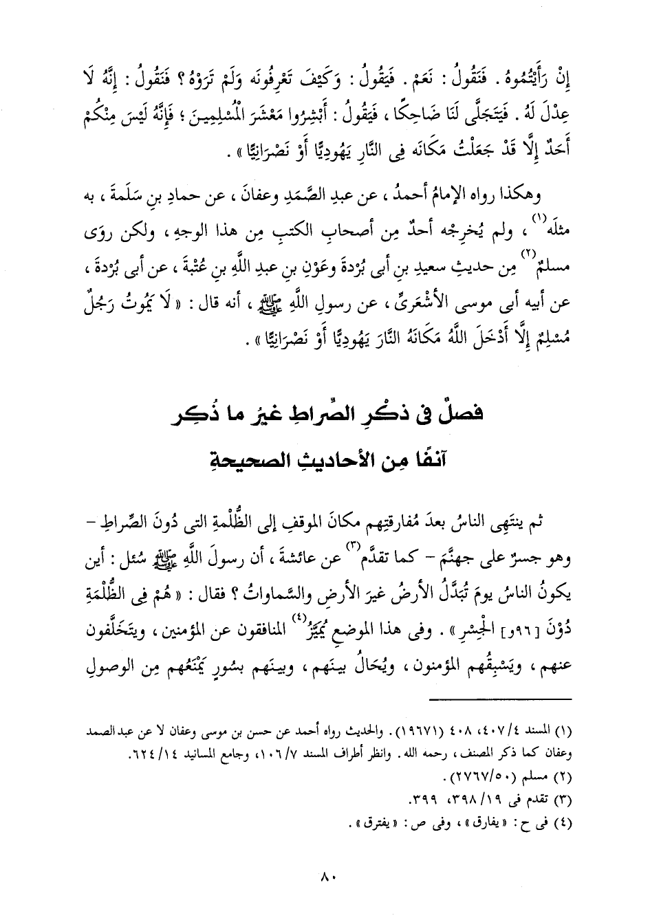 [فَصْلٌ فِي ذِكْرِ الصِّرَاطِ غَيْرُ مَا ذُكِرَ آنِفًا مِنَ الْأَحَادِيثِ الصَّحِيحَةِ]