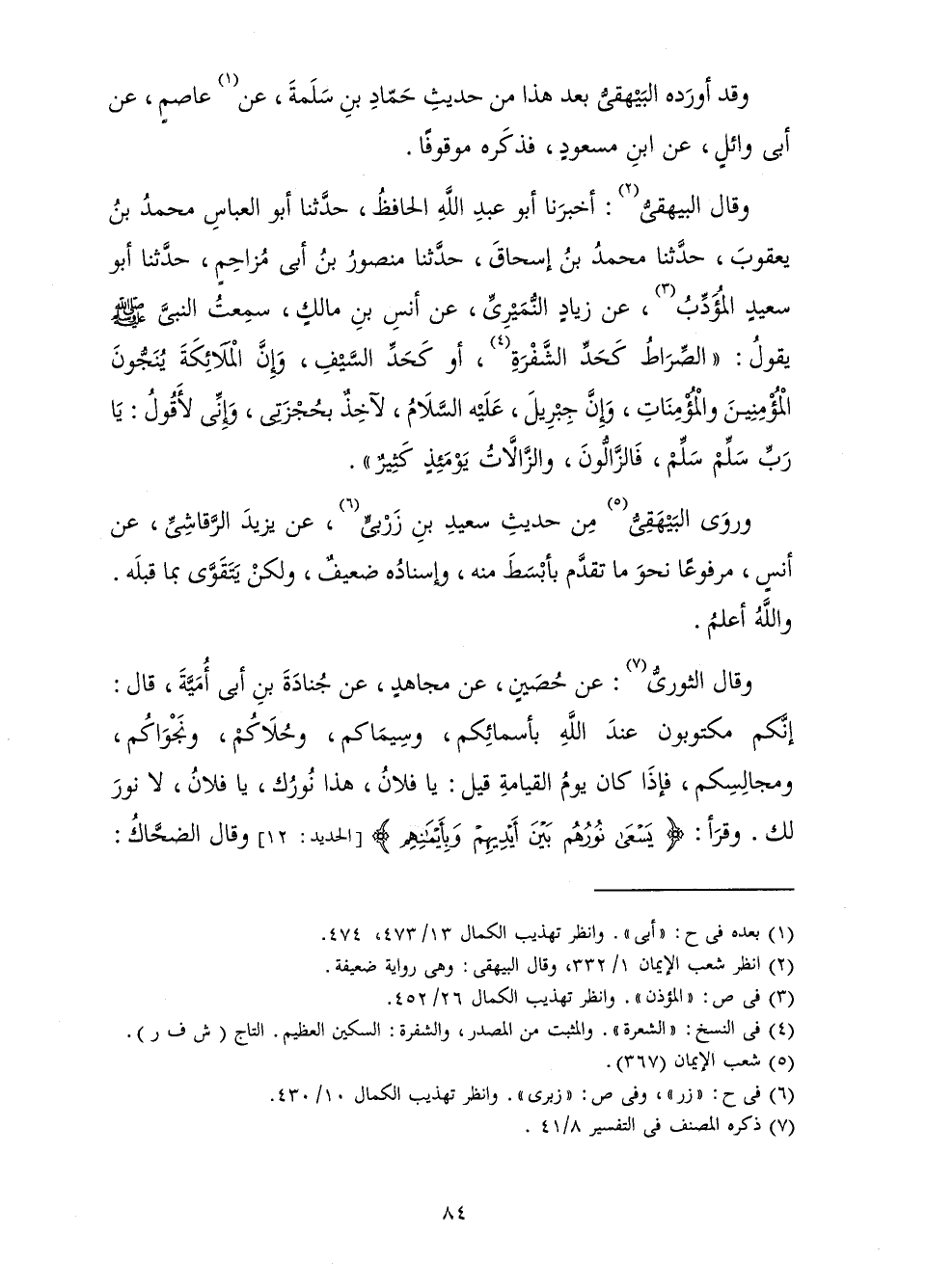 وَقَالَ الْبَيْهَقِيُّ: أَخْبَرَنَا أَبُو عَبْدِ اللَّهِ الْحَافِظُ، حَدَّثَنَا أَبُو الْعَبَّاسِ مُحَمَّدُ بْنُ يَعْقُوبَ، حَدَّثَنَا مُحَمَّدُ بْنُ إِسْحَاقَ، حَدَّثَنَا مَنْصُورُ بْنُ أَبِي مُزَاحِمٍ، حَدَّثَنَا أَبُو سَعِيدٍ الْمُؤَدِّبُ، عَنْ زِيَادٍ النُّمَيْرِيِّ، عَنْ أَنَسِ بْنِ مَالِكٍ، سَمِعْتُ النَّبِيَّ صَلَّى اللَّهُ عَلَيْهِ وَسَلَّمَ يَقُولُ: " «الصِّرَاطُ كَحَدِّ الشَّفْرَةِ، أَوْ كَحَدِّ السَّيْفِ، وَإِنَّ الْمَلَائِكَةَ يُنَجُّونَ الْمُؤْمِنِينَ وَالْمُؤْمِنَاتِ، وَإِنَّ جِبْرِيلَ، عَلَيْهِ السَّلَامُ، لَآخُذٌ بِحُجْزَتِي، وَإِنِّي لَأَقُولُ: يَا رَبِّ سَلِّمْ سَلِّمْ، فَالزَّالُّونَ، وَالزَّالَّاتُ يَوْمَئِذٍ كَثِيرٌ» ".