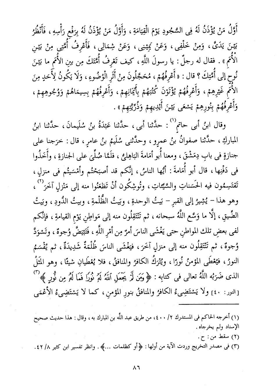 وَقَالَ ابْنُ أَبِي حَاتِمٍ: حَدَّثَنَا أَبِي، حَدَّثَنَا عَبْدَةُ بْنُ سُلَيْمَانَ، حَدَّثَنَا ابْنُ الْمُبَارَكِ، حَدَّثَنَا صَفْوَانُ بْنُ عَمْرٍو، وَحَدَّثَنِي سُلَيْمُ بْنُ عَامِرٍ، قَالَ: خَرَجْنَا عَلَى جِنَازَةٍ فِي بَابِ دِمَشْقَ، وَمَعَنَا أَبُو أُمَامَةَ الْبَاهِلِيُّ، فَلَمَّا صُلِّيَ عَلَى الْجِنَازَةِ، وَأَخَذُوا فِي دَفْنِهَا، قَالَ أَبُو أُمَامَةَ: أَيُّهَا النَّاسُ، إِنَّكُمْ قَدْ أَصْبَحْتُمْ وَأَمْسَيْتُمْ فِي مَنْزِلٍ، تَقْتَسِمُونَ فِيهِ الْحَسَنَاتِ وَالسَّيِّئَاتِ، وَتُوشِكُونَ أَنْ تَظْعَنُوا مِنْهُ إِلَى مَنْزِلٍ آخَرَ، وَهُوَ هَذَا - يُشِيرُ إِلَى الْقَبْرِ - بَيْتُ الْوَحْدَةِ، وَبَيْتُ الظُّلْمَةِ، وَبَيْتُ الدُّودِ، وَبَيْتُ الضِّيقِ، إِلَّا مَا وَسَّعَ اللَّهُ سُبْحَانَهُ، ثُمَّ تَنْتَقِلُونَ مِنْهُ إِلَى مَوَاطِنِ يَوْمِ الْقِيَامَةِ، فَإِنَّكُمْ لَفِي بَعْضِ تِلْكَ الْمَوَاطِنِ حَتَّى يَغْشَى النَّاسَ أَمْرٌ مِنْ أَمْرِ اللَّهِ، فَتَبْيَضُّ وُجُوهٌ، وَتَسْوَدُّ وُجُوهٌ، ثُمَّ تَنْتَقِلُونَ مِنْهُ إِلَى مَنْزِلٍ آخَرَ، فَيَغْشَى النَّاسَ ظُلْمَةٌ شَدِيدَةٌ، ثُمَّ يُقْسَمُ النُّورُ، فَيُعْطَى الْمُؤْمِنُ نُورًا، وَيُتْرَكُ الْكَافِرُ وَالْمُنَافِقُ، فَلَا يُعْطَيَانِ شَيْئًا، وَهُوَ الْمَثَلُ الَّذِي ضَرَبَهُ اللَّهُ تَعَالَى فِي كِتَابِهِ: {وَمَنْ لَمْ يَجْعَلِ اللَّهُ لَهُ نُورًا فَمَا لَهُ مِنْ نُورٍ} [النور: 40] وَلَا يَسْتَضِيءُ الْكَافِرُ وَالْمُنَافِقُ بِنُورِ الْمُؤْمِنِ، كَمَا لَا يَسْتَضِيءُ الْأَعْمَى
