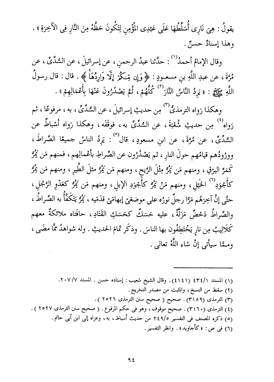 وَهَكَذَا رَوَاهُ التِّرْمِذِيُّ مِنْ حَدِيثِ إِسْرَائِيلَ، عَنِ السُّدِّيِّ، بِهِ، مَرْفُوعًا، ثُمَّ رَوَاهُ مِنْ حَدِيثِ شُعْبَةَ، عَنِ السُّدِّيِّ بِهِ، فَوَقَفَهُ، وَهَكَذَا رَوَاهُ أَسْبَاطٌ عَنِ السُّدِّيِّ، عَنْ مُرَّةَ، عَنِ ابْنِ مَسْعُودٍ، قَالَ: يَرِدُ النَّاسُ جَمِيعًا الصِّرَاطَ، وَوُرُودُهُمْ قِيَامُهُمْ حَوْلَ النَّارِ، ثُمَّ يَصْدُرُونَ عَنِ الصِّرَاطِ بِأَعْمَالِهِمْ، فَمِنْهُمْ مَنْ يَمُرُّ كَمَرِّ الْبَرْقِ، وَمِنْهُمْ مَنْ يَمُرُّ مِثْلَ الرِّيحِ، وَمِنْهُمْ مَنْ يَمُرُّ مِثْلَ الطَّيْرِ، وَمِنْهُمْ مَنْ يَمُرُّ كَأَجْوَدِ الْخَيْلِ، وَمِنْهُمْ مَنْ يَمُرُّ كَأَجْوَدِ الْإِبِلِ، وَمِنْهُمْ مَنْ يَمُرُّ كَعَدْوِ الرَّجُلِ، حَتَّى إِنَّ آخِرَهُمْ مَرًّا رَجُلٌ نُورُهُ عَلَى مَوْضِعَيْ إِبْهَامَيْ قَدَمَيْهِ، يَمُرُّ يَتَكَفَّأُ بِهِ الصِّرَاطُ، وَالصِّرَاطُ دَحْضٌ مَزَلَّةٌ، عَلَيْهِ حَسَكٌ كَحَسَكِ الْقَتَادِ، حَافَتَاهُ مَلَائِكَةٌ مَعَهُمْ كَلَالِيبُ مِنْ نَارٍ يَخْتَطِفُونَ بِهَا النَّاسَ. وَذَكَرَ تَمَامَ الْحَدِيثِ. وَلَهُ شَوَاهِدُ مِمَّا مَضَى، وَمِمَّا سَيَأْتِي إِنْ شَاءَ اللَّهُ تَعَالَى.