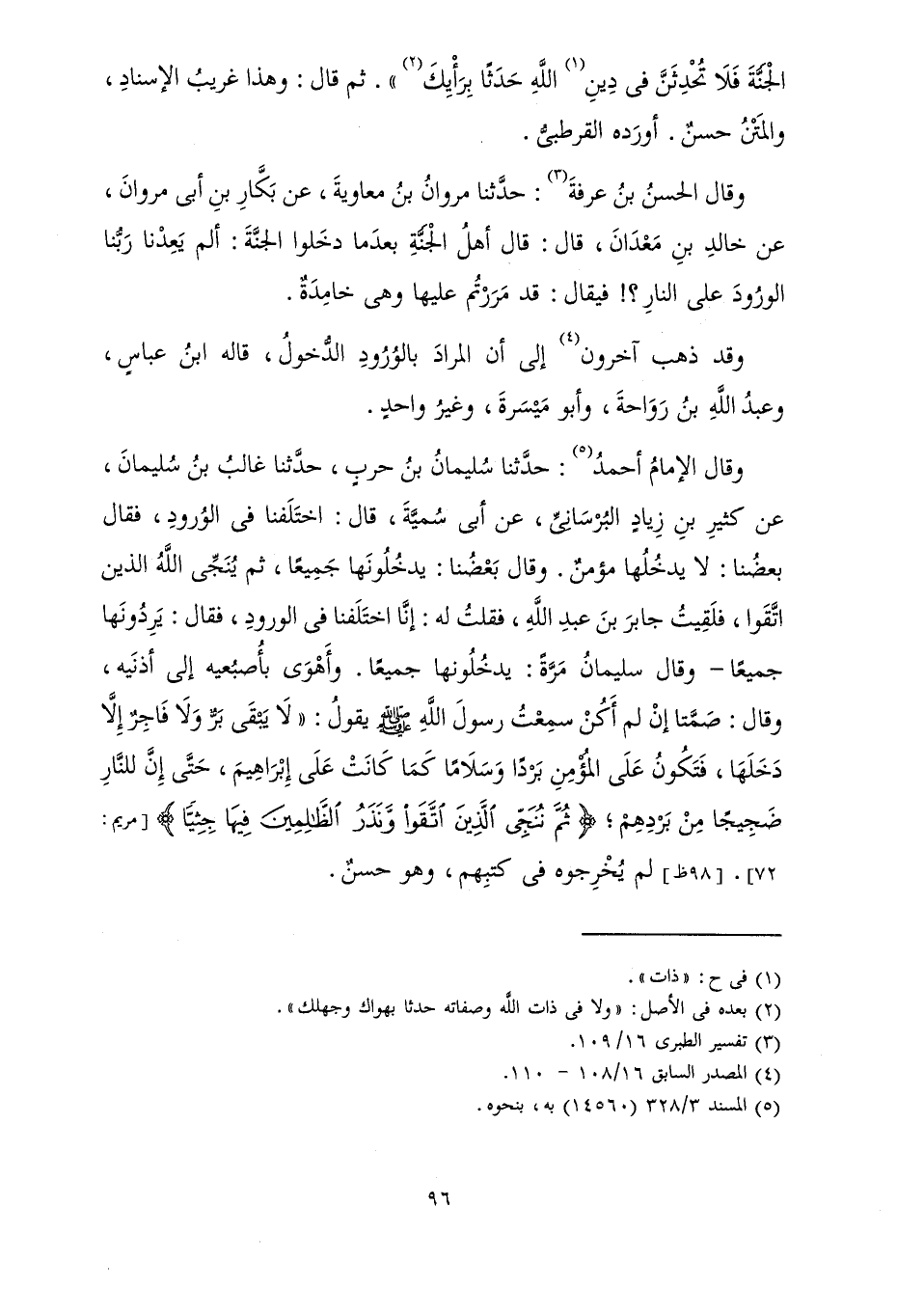 وَقَالَ الْإِمَامُ أَحْمَدُ: حَدَّثَنَا سُلَيْمَانُ بْنُ حَرْبٍ، حَدَّثَنَا غَالِبُ بْنُ سُلَيْمَانَ، عَنْ كَثِيرِ بْنِ زِيَادٍ الْبُرْسَانِيِّ، «عَنْ أَبِي سُمَيَّةَ، قَالَ: اخْتَلَفْنَا فِي الْوُرُودِ، فَقَالَ بَعْضُنَا: لَا يَدْخُلُهَا مُؤْمِنٌ. وَقَالَ بَعْضُنَا: يَدْخُلُونَهَا جَمِيعًا، ثُمَّ يُنَجِّي اللَّهُ الَّذِينَ اتَّقَوْا، فَلَقِيتُ جَابِرَ بْنَ عَبْدِ اللَّهِ، فَقُلْتُ لَهُ: إِنَّا اخْتَلَفْنَا فِي الْوُرُودِ، فَقَالَ: يَرِدُونَهَا جَمِيعًا - وَقَالَ سُلَيْمَانُ مَرَّةً: يَدْخُلُونَهَا جَمِيعًا. وَأَهْوَى بِأُصْبُعَيْهِ إِلَى أُذُنَيْهِ، وَقَالَ: صَمَّتَا إِنْ لَمْ أَكُنْ سَمِعْتُ رَسُولَ اللَّهِ صَلَّى اللَّهُ عَلَيْهِ وَسَلَّمَ يَقُولُ: " لَا يَبْقَى بَرٌّ وَلَا فَاجِرٌ إِلَّا دَخَلَهَا، فَتَكُونُ عَلَى الْمُؤْمِنِ بَرْدًا وَسَلَامًا كَمَا كَانَتْ عَلَى إِبْرَاهِيمَ، حَتَّى إِنَّ لِلنَّارِ ضَجِيجًا مِنْ بَرْدِهِمْ ; {ثُمَّ نُنَجِّي الَّذِينَ اتَّقَوْا وَنَذَرُ الظَّالِمِينَ فِيهَا جِثِيًّا} [مريم: 72] » [مَرْيَمَ: 72] . لَمْ يُخْرِجُوهُ فِي كُتُبِهِمْ، وَهُوَ حَسَنٌ.