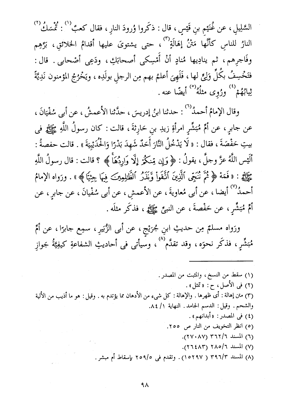وَقَالَ الْإِمَامُ أَحْمَدُ: حَدَّثَنَا ابْنُ إِدْرِيسَ، حَدَّثَنَا الْأَعْمَشُ، عَنْ أَبِي سُفْيَانَ، عَنْ جَابِرٍ، عَنْ أُمِّ مُبَشِّرٍ امْرَأَةِ زَيْدِ بْنِ حَارِثَةَ، قَالَتْ: «كَانَ رَسُولُ اللَّهِ صَلَّى اللَّهُ عَلَيْهِ وَسَلَّمَ فِي بَيْتِ حَفْصَةَ، فَقَالَ: " لَا يَدْخُلُ النَّارَ أَحَدٌ شَهِدَ بَدْرًا وَالْحُدَيْبِيَةَ ". قَالَتْ حَفْصَةُ: أَلَيْسَ اللَّهُ عَزَّ وَجَلَّ، يَقُولُ: {وَإِنْ مِنْكُمْ إِلَّا وَارِدُهَا} [مريم: 71] قَالَتْ: قَالَ رَسُولُ اللَّهِ صَلَّى اللَّهُ عَلَيْهِ وَسَلَّمَ: " فَمَهْ {ثُمَّ نُنَجِّي الَّذِينَ اتَّقَوْا وَنَذَرُ الظَّالِمِينَ فِيهَا جِثِيًّا} [مريم: 72] » وَرَوَاهُ الْإِمَامُ أَحْمَدُ أَيْضًا، عَنْ أَبِي مُعَاوِيَةَ، عَنِ الْأَعْمَشِ، عَنْ أَبِي سُفْيَانَ، عَنْ جَابِرٍ، عَنْ أُمِّ مُبَشِّرٍ، عَنْ حَفْصَةَ، عَنِ النَّبِيِّ صَلَّى اللَّهُ عَلَيْهِ وَسَلَّمَ، فَذَكَرَ مِثْلَهُ.
