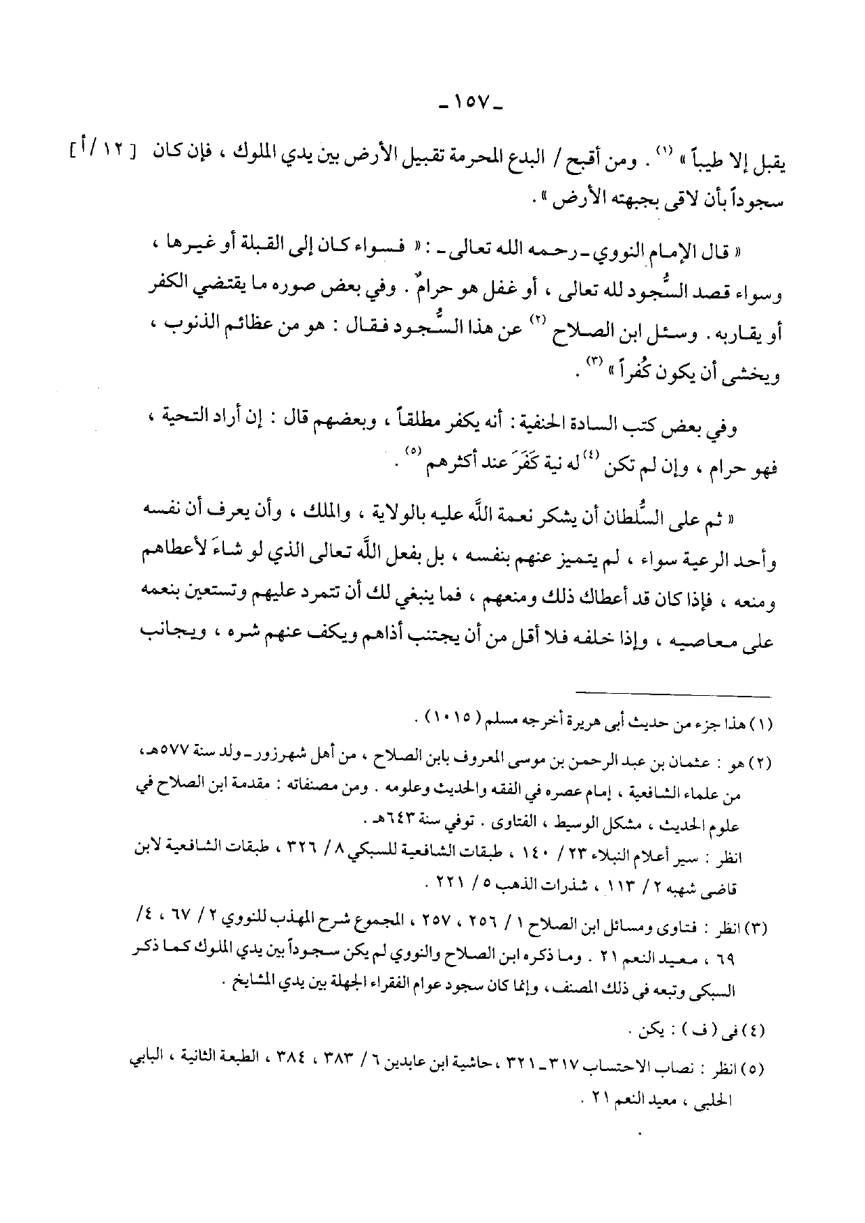 "قال الإمام النووي – رحمه الله تعالى -: "فسواء كان إلى القبلة أو غيرها، وسواء قصد السجود لله تعالى، أو غفل هو حرام. وفي بعض صوره ما يقتضي الكفر أو يقاربه. وسئل ابن الصلاح عن هذا السجود فقال: هو من عظائم الذنوب، ويخشى أن يكون كفراً".