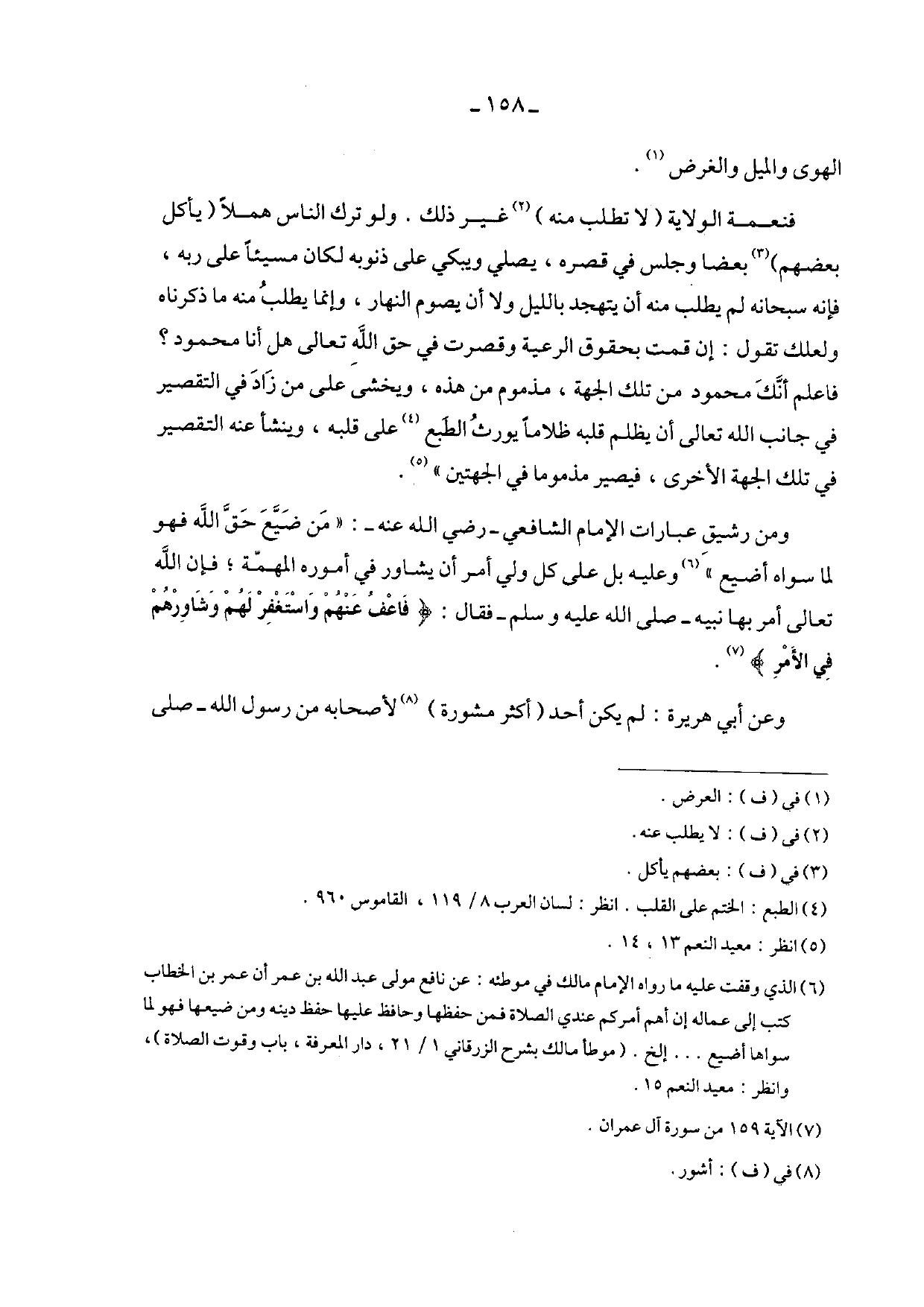 فنعمة الولاية (لا تطلب منه) غير ذلك. ولو ترك الناس هملاً (يأكل بعضهم) بعضاً وجلس في قصره، يصلي ويبكي على ذنوبه لكان مسيئاً على ربه، فإنه سبحانه لم يطلب منه أن يتهجد بالليل ولا أن يصوم النهار، وإنما يطلب منه ما ذكرناه ولعلك تقول: إن قمت بحقوق الرعية وقصرت في حق الله تعالى هل أنا محمود؟ فاعلم أنك محمود من تلك الجهة، مذموم من هذه، ويخشى على من زاد في التقصير في جانب الله تعالى أن يظلم قلبه ظلاماً يورث الطبع على قلبه، وينشأ عن التقصير في تلك الجهة الأخرى، فيصير مذموماً في الجهتين".