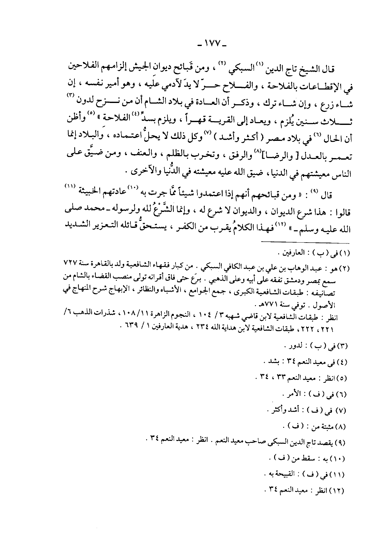 قال الشيخ تاج الدين السبكي، ومن قبائح ديوان الجيش إلزامهم الفلاحين في الإقطاعات بالفلاحة، والفلاح حر لا يد لآدمي عليه، وهو أمير نفسه، إن شاء زرع، وإن شاء ترك، وذكر أن العادة في بلاد الشام أن من نزح لدون ثلاث سنين يلزم، ويعاد إلى القرية قهراً، ويلزم بسد الفلاحة" وأظن أن الحال في بلاد مصر (أكثر وأشد) وكل ذلك لا يحل اعتماده، والبلاد إنما تعمر بالعدل [والرضا] والرفق، وتخرب بالظلم، والعنف، ومن ضيق على الناس معيشتهم في الدنيا، ضيق الله عليه معيشته في الدنيا والآخرة.