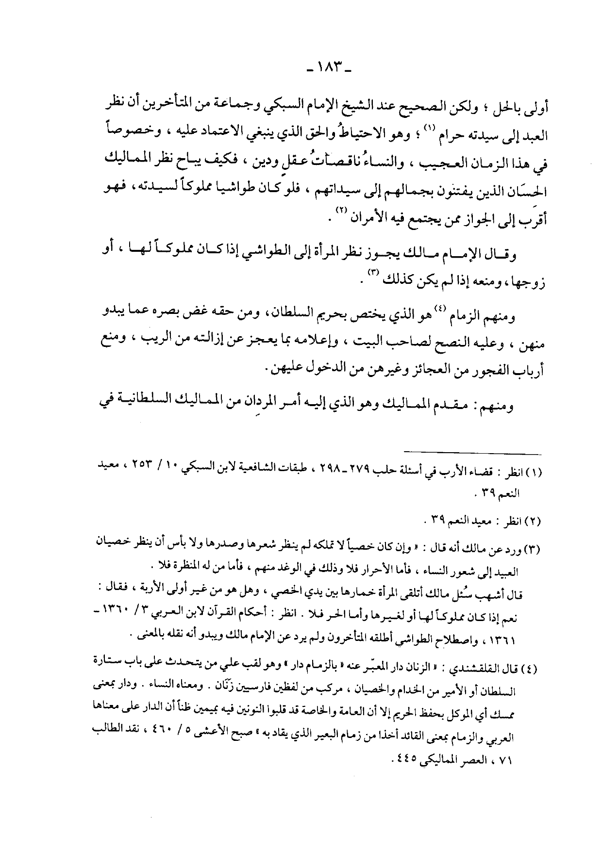 أولى بالحل؛ ولكن الصحيح عند الشيخ الإمام السبكي وجماعة من المتأخرين أن نظر العبد إلى سيدته حرام؛ وهو الاحتياط والحق الذي ينبغي الاعتماد عليه، وخصوصاً في هذا الزمان العجيب، والنساء ناقصات عقل ودين، فكيف يباح نظر المماليك الحسان الذين يفتنون بجمالهم إلى سيداتهم، فلو كان طواشياً مملوكاً لسيدته، فهو أقرب إلى الجواز ممن يجتمع فيه الأمران.