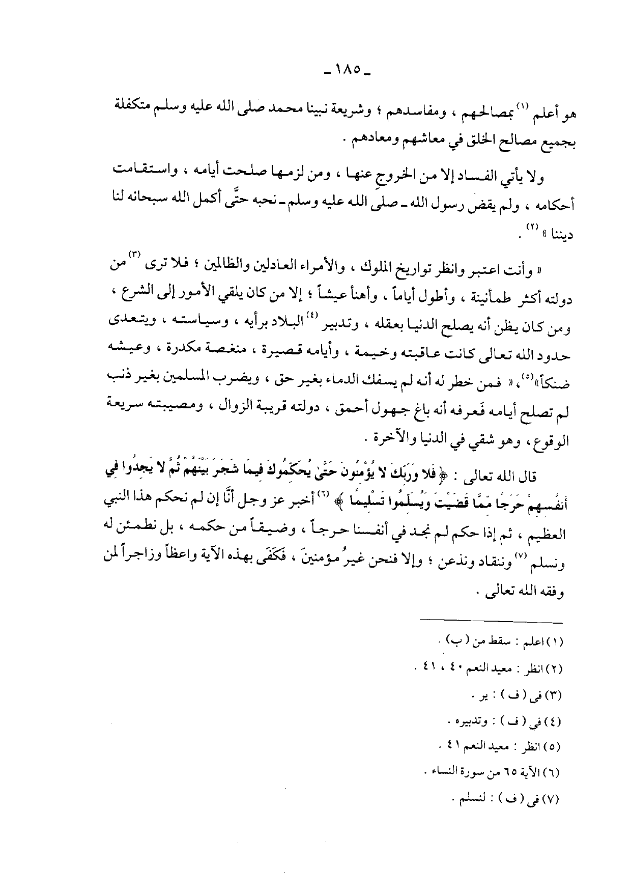 "وأنت اعتبر وانظر تواريخ الملوك، والأمراء العادلين والظالمين؛ فلا ترى من دولته أكثر طمأنينة، وأطول أياماً، وأهنأ عيشاً؛ إلا من كان يلقي الأمور إلى الشرع، ومن كان يظن أنه يصلح الدنيا بعقله، وتدبير البلاد برأيه، وسياسته، ويتعدى حدود الله تعالى كانت عاقبته وخيمة، وأيامه قصيرة، منغصة مكدرة، وعيشه ضنكاً"، "فمن خطر له أنه لم يسفك الدماء بغير حق، ويضرب المسلمين بغير ذنب لم تصلح أيامه فعرفه أنه باغ جهول أحمق، دولته قريبة الزوال، ومصيبته سريعة الوقوع، وهو شقي في الدنيا والآخرة.