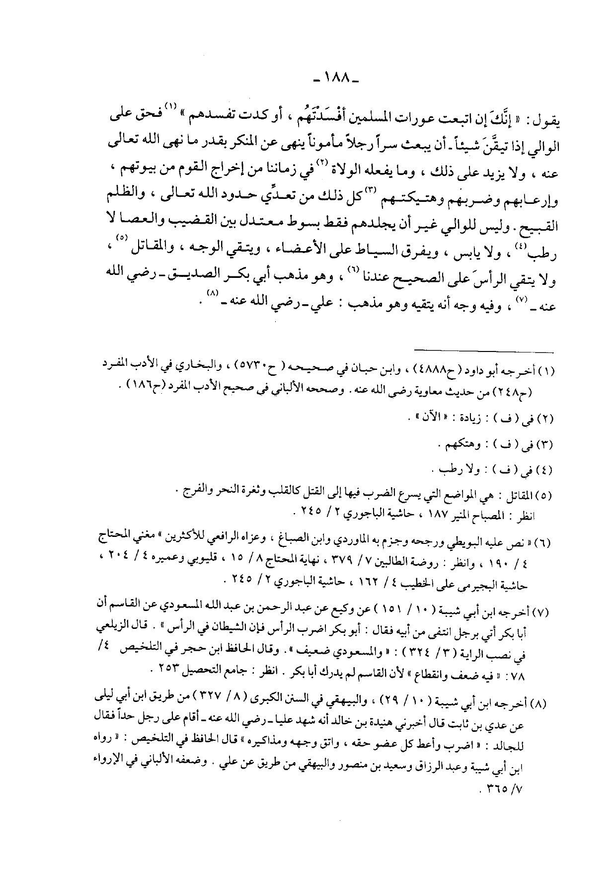 يقول: "إنك إن اتبعت عورات المسلمين أفسدتهم، أو كدت تفسدهم" فحق على الوالي إذا تيقن شيئاً - أن يبعث سراً رجلاً مأموناً ينهى عن المنكر بقدر ما نهى الله تعالى عنه، ولا يزيد على ذلك، وما يفعله الولاة في زماننا من إخراج القوم من بيوتهم، وإرعابهم وضربهم وهتيكتهم كل ذلك من تعدي حدود الله تعالى، والظلم القبيح. وليس للوالي غير أن يجلدهم فقط بسوط معتدل بين القضيب والعصا لا رطب، ولا يابس، ويفرق السياط على الأعضاء، ويتقي الوجه، والمقتل، ولا يتقي الرأس على الصحيح عندنا، وهو مذهب أبي بكر الصديق - رضي الله عنه -، وفيه وجه أن يتقيه وهو مذهب: علي - رضي الله عنه -.